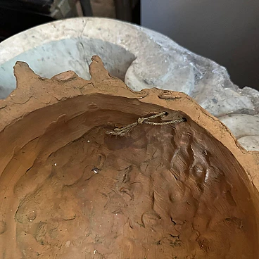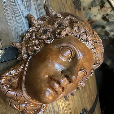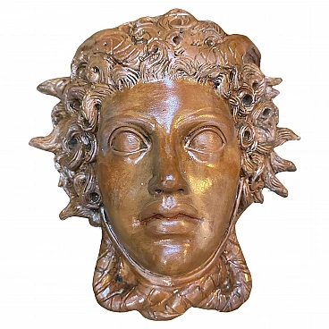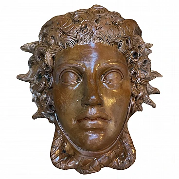 Una testa di Medusa in terracotta smaltata realizzata a mano a Caltagirone, piccola città della Sicilia famosa per le ceramiche artigianali. La testa ha uno smalto marrone con segni di età.