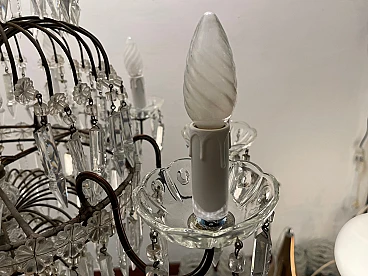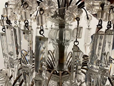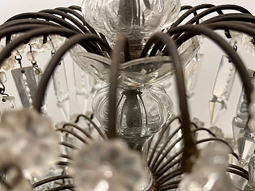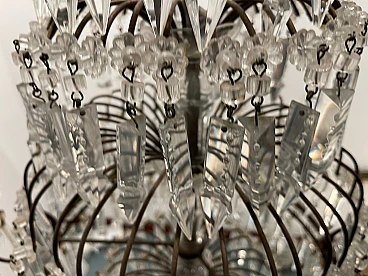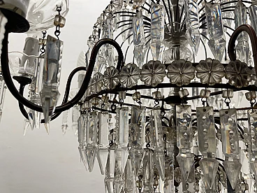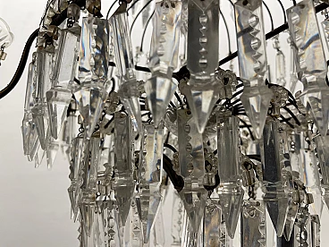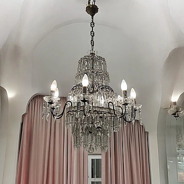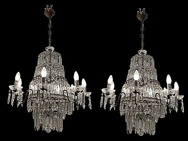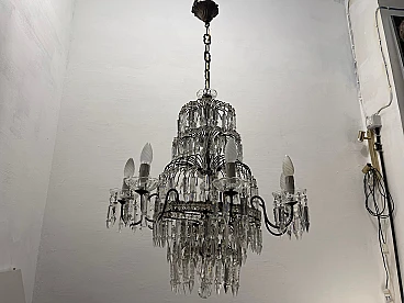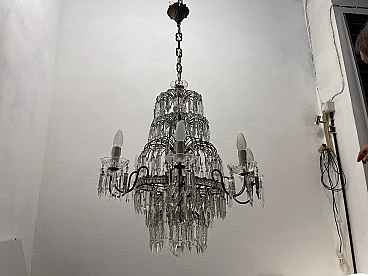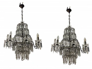 Coppia di grandi lampadari a cascata in cristallo, anni '40. Prezzo - € 2500,00 per set. Vintage, Italia, progettazione anni '20-'40. Struttura in metallo bronzo scuro con cristalli pendenti. Altezza 110 cm con catena, altezza senza catena 70 cm, larghezza 66 cm. Caratteristiche 8 luci, richiede lampadine E14. Cablaggio controllato dal nostro elettricista. Peso standard tra 40 kg e 80 kg. Condizioni buone, questo articolo vintage/antico può presentare alcuni segni di usura come graffi e altri segni del tempo. Leggera usura coerente con l'età e l'uso, patina coerente con l'età e l'uso, componenti elettrici ricablati e/o nuovi. Questo pezzo è in condizioni di funzionare? Sì, ho fatto ricablare il pezzo da un elettricista professionista.