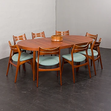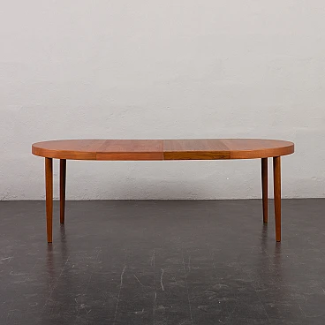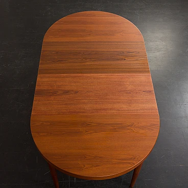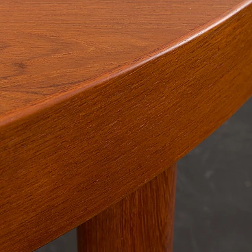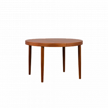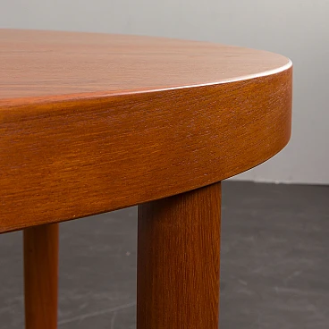 Tavolo allungabile danese rotondo in teak, anni '60. Strettamente legato ai design di Kai Kristiansen dell'epoca, presenta linee pulite, artigianalità e un armonioso mix di funzionalità e bellezza. L'uso del legno di teak, una scelta popolare tra i produttori di mobili danesi di quell'epoca, non solo emana calore e ricchezza ma mostra anche l'alto livello di abilità e abilità artistica coinvolte nella sua costruzione. L'intelligente meccanismo di estensione del tavolo gli consente di passare senza soluzione di continuità da una dimensione compatta a una superficie più ampia, soddisfacendo esigenze e occasioni diverse. Il tavolo presenta due prolunghe aggiuntive, una delle quali ha una tonalità leggermente più scura. Questa differenza di colore può essere attribuita all'uso meno frequente del tavolo completamente esteso da parte del precedente proprietario. Nel tempo, il legno naturale cambierà colore. È stato deciso di non unificare la tonalità poiché riflette la lunga storia del mobile. La prolunga più scura aggiunge interesse visivo se posizionata tra le parti di colore più chiaro. Il tavolo è stato controllato ed è in ottime condizioni originali con minimi segni di utilizzo considerando la sua età. Il timbro "DANISH FURNITUREMAKERS QUALITY", situato nella parte inferiore, ne certifica l'autenticità e l'alta qualità artigianale. Il legno è stato pulito con composti professionali e la superficie è quasi immacolata. Le gambe sono staccabili, facilitando il trasporto e lo stoccaggio dei mobili. Altezza al piano: 65 cm. Larghezza di una singola prolunga: 49 cm.