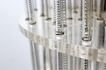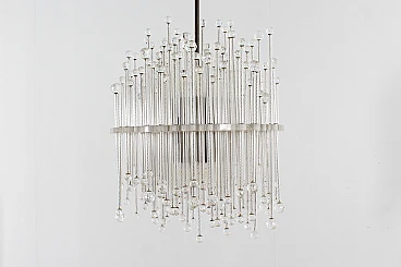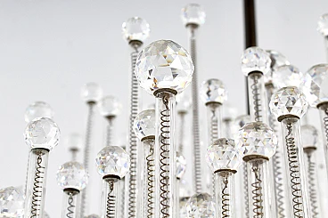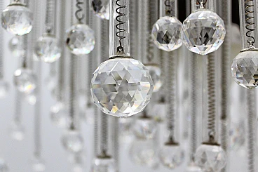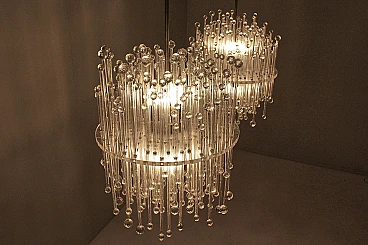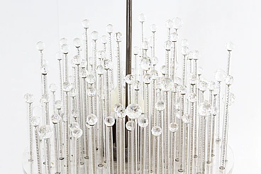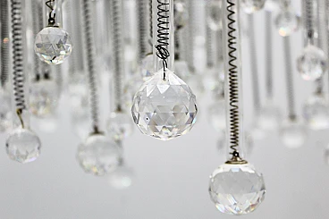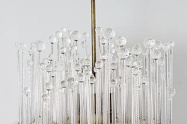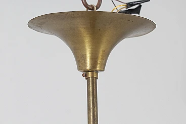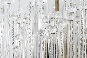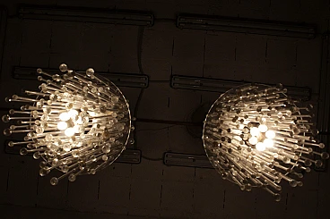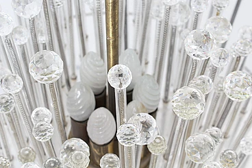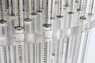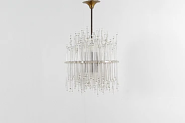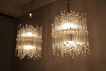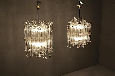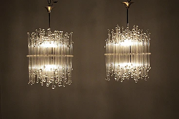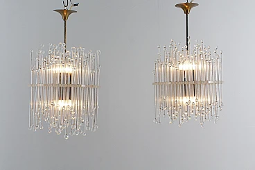 Coppia di lampadari in plexi, vetro, cristallo e ottone, Italia '60