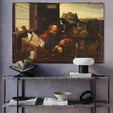 Grande dipinto fiammingo della prima metà del XVII secolo. Opera ad olio su tela con un raffinatissimo San Girolamo nello studio, dal grande fascino. Padre e dottore della chiesa, fu un celebre studioso e tradusse in latino i Vangeli e l'Antico Testamento. Il Santo viene raffigurato in abiti cardinalizi mentre legge un libro in un piccolo studio pieno di oggetti che testimoniano la sua erudizione ed i suoi interessi. Trovano posto anche alcuni memento mori (letteralmente ricordati che devi morire) come la candela spenta, la clessidra e il teschio che il Santo indica al centro della composizione. Una grande finestra si apre su un bellissimo paesaggio con figure e una piccolo villaggio nordico sullo sfondo. Quadro di notevole qualità pittorica, riscontrabile in particolare nella realizzazione dei minuziosi dettagli dello studio. Opera che ha subito un intervento di restauro con rintelo, sostituzione del telaio e ripresa del colore in alcuni punti. Nel complesso in buono stato conservativo, con alcuni segni del tempo.