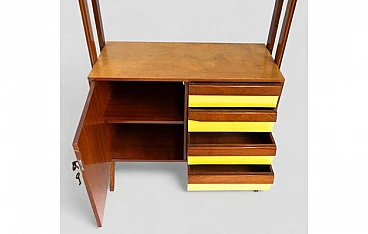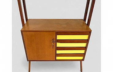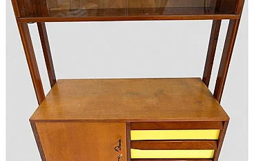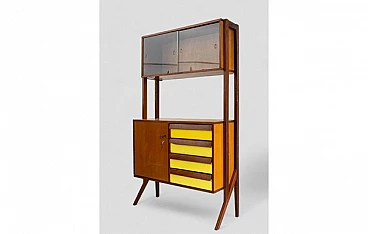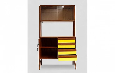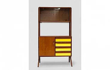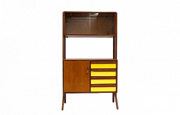 Credenza in legno con inserti gialli, vetrina e 4 cassetti, anni '50