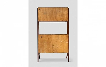 Credenza anni '50, nella parte superiore è presente un piccolo mobile con vetro scorrevole, nella parte inferiore a sinistra un'anta con all'interno un ripiano a mezza altezza, 4 cassetti gialli nella parte destra. Segni di usura dovuti all'età e all'uso. Misure: Altezza 180 cm; Larghezza 98 cm; Profondità 44 cm.