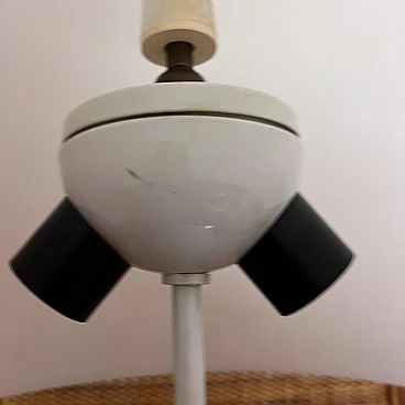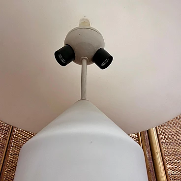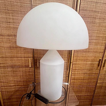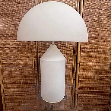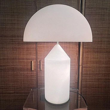 Lampada da tavolo mod. Atollo 235 di Vico Magistretti per Oluce, anni '70. Lampada a luce diretta e diffusa in vetro di Murano opalino, con dimmer universale. Ideata nel 1977 da Magistretti, Atollo è diventata negli anni l'archetipo della lampada da tavolo, vincendo il Compasso d'Oro nel 1979 e rivoluzionando completamente il modo di immaginare il classico abat-jour. Le forme geometriche che la compongono - il cilindro, il cono e la semisfera - hanno dato vita a un prodotto decorativo ed essenziale allo stesso tempo, slegato dal periodo storico dalle mode del momento e divenuto ormai a pieno titolo una delle icone del design italiano. La Atollo è stata progettata in più misure e in diversi materiali. Questa è la versione più grande e più raffinata, in quanto, illuminata anche nel corpo cilindrico. Inoltre non è di recente produzione o nuova ma un pezzo autentico e d'epoca.