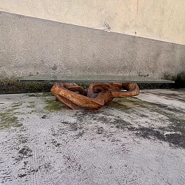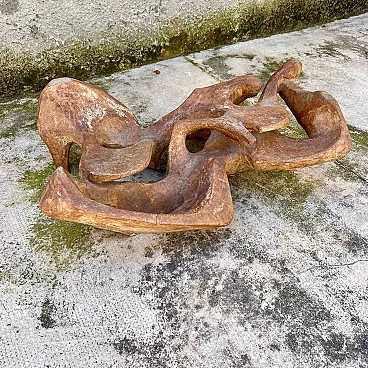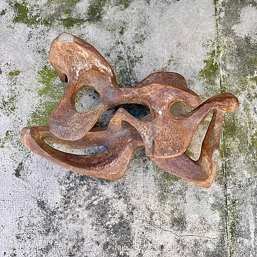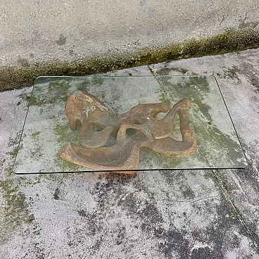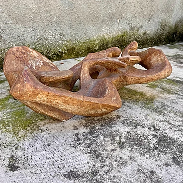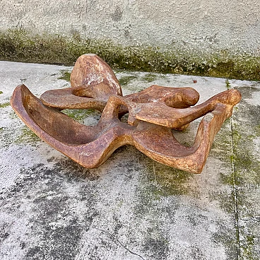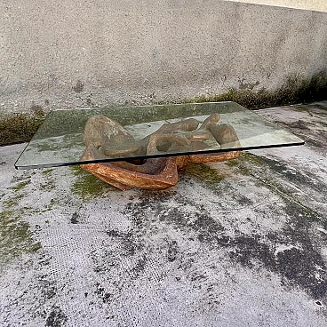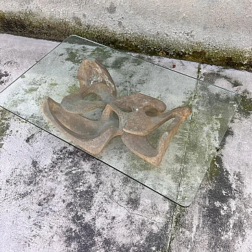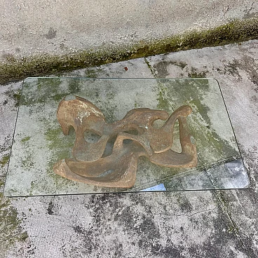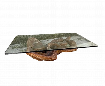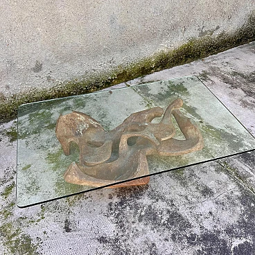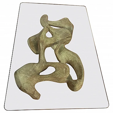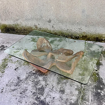 Tavolino scultoreo in cemento e vetro nello stile di Henry Moore, anni '50. Oggetto ipnotico: da qualunque angolazione lo si guardi, lo si vede e lo si interpreta in maniera diversa. La scultura che regge il vetro, realizzata in cemento con un'anima in ferro (quasi sicuramente), ha una forma antropomorfa che lascia intravedere la sinuosità femminile. Una figura organica, insomma, che si plasma tra se stessa, girandosi intorno, attraversandosi e dilatando le sue curve in un gioco di movimenti materici, quasi psichedelici. Porta addosso le tracce del tempo, pertanto alcuni dei segni dovuti alla sua delicatezza sono visibili ma anche restaurati e, in ogni caso, non compromettono la solidità o la scultura stessa.