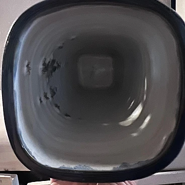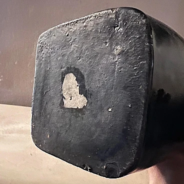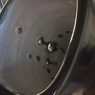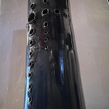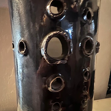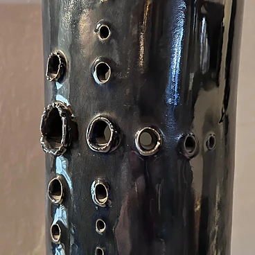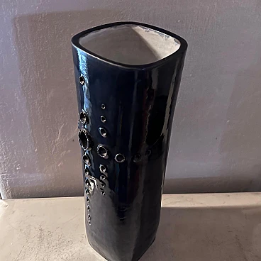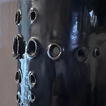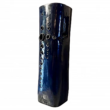 Grande vaso realizzato a mano in ceramica di grosso spessore, dipinto in un intenso blu, esternamente e bianco, internamente. La sezione del vaso è quadrata con angoli stondati. Su un lato ha una decorazione composta da una serie di fori di vari calibri, realizzati a mano. Si noti che i fori, considerando le sbavature dei contorni, sono stati realizzati dall'interno verso l'esterno. È presumibili quindi, siano stati concepiti dopo aver steso la ceramica come fosse un foglio, forata e poi lavorata fino a chiuderla a cilindro. A questo punto applicato il fondo, messa in cottura. L'artista è sconosciuto ma è facile pensare rientri nella cerchia artistica di Albisola.