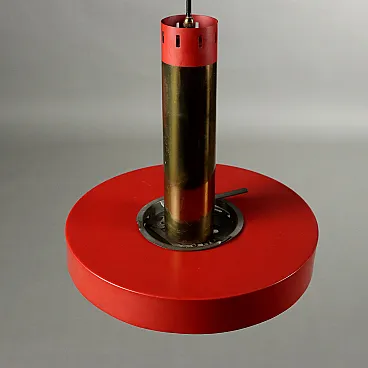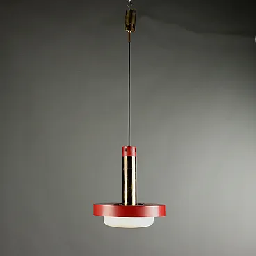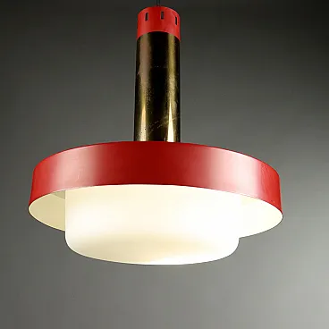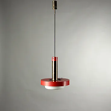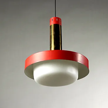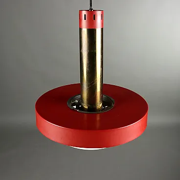 Lampadario in metallo rosso smaltato, ottone e vetro, anni '60