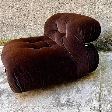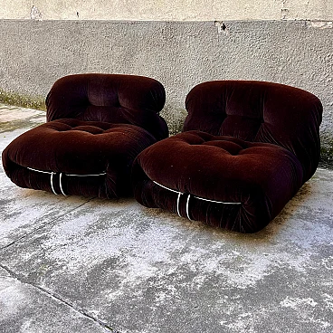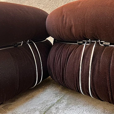 Coppia di poltrone Soriana di Afra e Tobia Scarpa per Cassina, anni '70. Questi pezzi sono un perfetto esempio di design italiano di alta classe e combinano comfort, eleganza e qualità. Le poltrone Soriana sono famose per il loro stile unico e avvolgente. Il design innovativo combina una struttura in metallo cromato che avvolge il morbido cuscino in velluto, creando un effetto visivo di grande impatto e un'esperienza di seduta estremamente confortevole. Rivestimento originale in velluto marrone di alta qualità, che aggiunge un tocco di lusso e raffinatezza. Il velluto è in condizioni eccellenti con lievi segni di usura coerenti con l'età che aggiungono carattere e autenticità ai pezzi. Soriana è dotata di due rotelle sul lato anteriore, mentre sul lato posteriore ha due grossi piedi in plastica stampata; uno di questi è danneggiato ma ciò non compromette la stabilità e la funzionalità delle poltrone. La serie "Soriana" ha vinto il premio Compasso d'Oro nel 1970. Entrambe le poltrone sono in condizioni molto buone. La struttura è solida e stabile, senza difetti strutturali. Il velluto presenta una leggera patina che testimonia la storia e l'autenticità delle poltrone. La seduta è ampia e accogliente, perfetta per momenti di relax. Altezza della seduta: 37 cm.