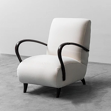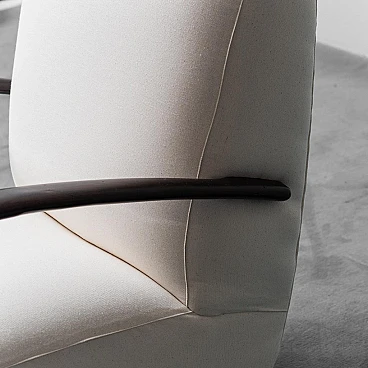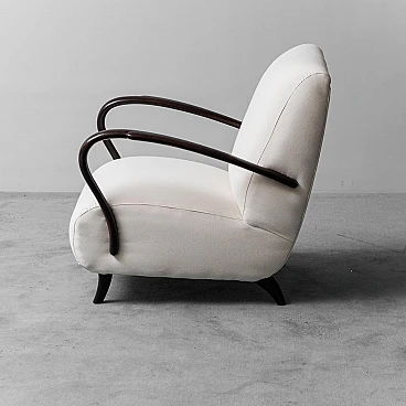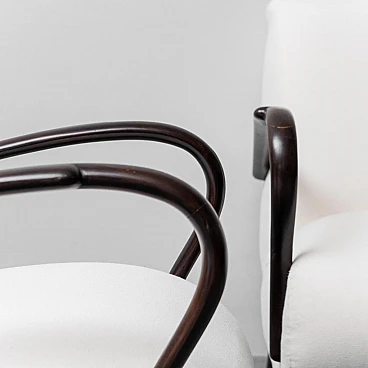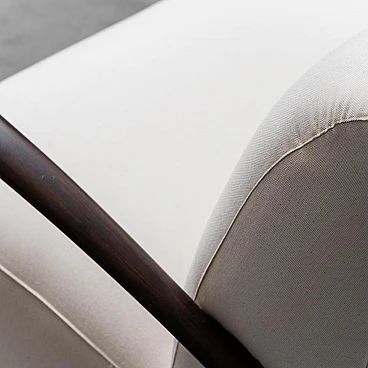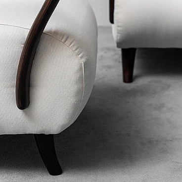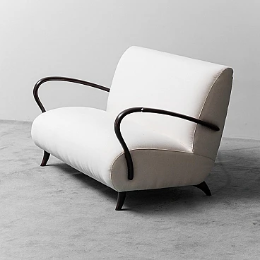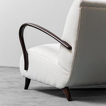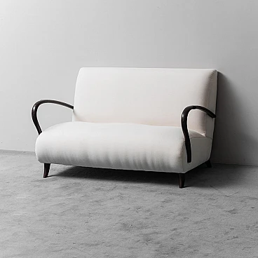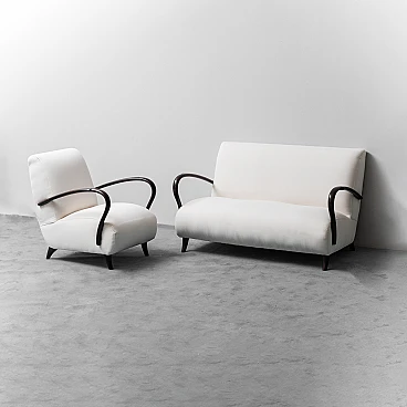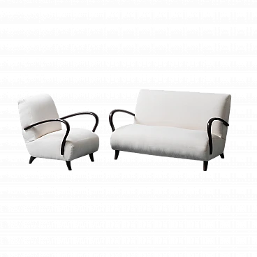 Divano a due posti e poltrona in legno e tessuto bianco, anni '60