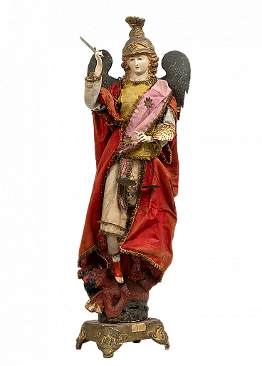 schiacciare Satana, rappresentato ai suoi piedi, puntandolo con la spada che regge nella destra; alla sua sinistra pende una catena con una bilancia. La statua ha la testa in terracotta e mani e piedi in legno ed è modellata e dipinta con particolari dorati. Gli abiti usurati dal tempo sono coevi. Provenienza: Napoli inizio XX secolo. Misure: 30x20 cm, H 83 cm. Certificato di Autenticità. Siamo a vostra disposizione per ulteriori chiarimenti o particolari fotografici. Spedizione in tutta Italia, Europa e resto del mondo a prezzi molto contenuti, in massima sicurezza e tracciabilità. La spedizione sarà concordata privatamente.