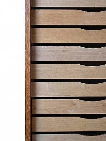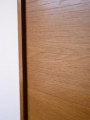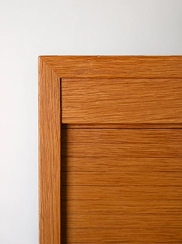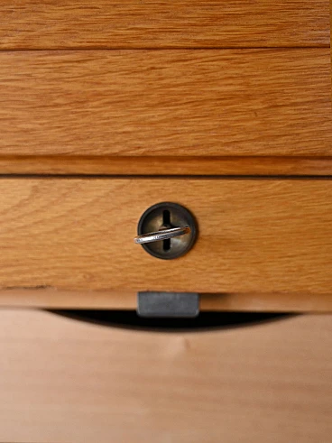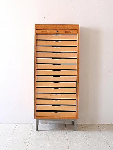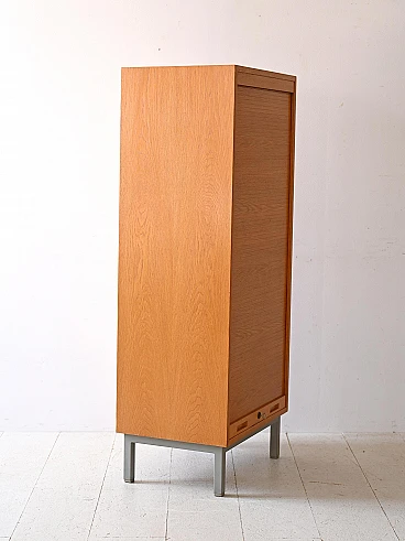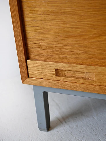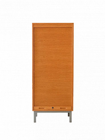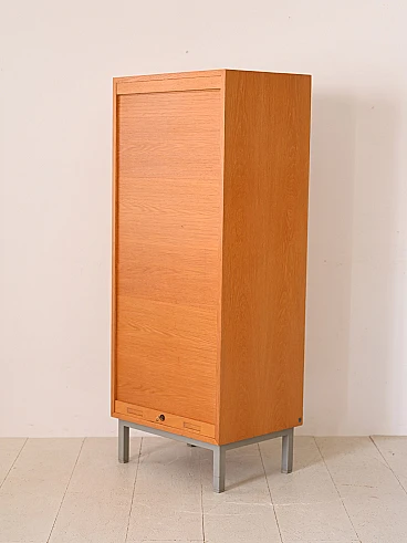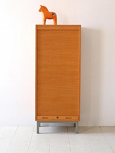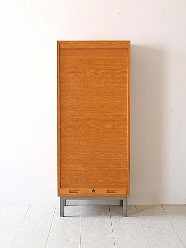 Mobile vintage con anta a serranda. Un pezzo d'arredo originale che combina lo stile moderno e industriale. Realizzato in pregiato legno di rovere, si distingue per la serranda a rullo che scorre verso l'alto, rivelando ampi vani interni per documenti e oggetti. Le gambe in metallo aggiungono un tocco industriale e robusto che contrastano con il calore del legno. Questo design minimalista riflette la filosofia del design scandinavo, valorizzando semplicità e funzionalità. Ideale per uffici, studi o come elemento distintivo in un soggiorno, questo mobile unisce stile e praticità, rendendolo un'aggiunta elegante a qualsiasi spazio. Buone condizioni. È stato fatto un restauro conservativo utilizzando materiali naturali. Potrebbe presentare dei segni del tempo. Per piacere presta attenzione alle fotografie.