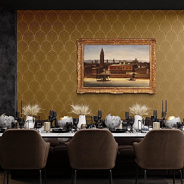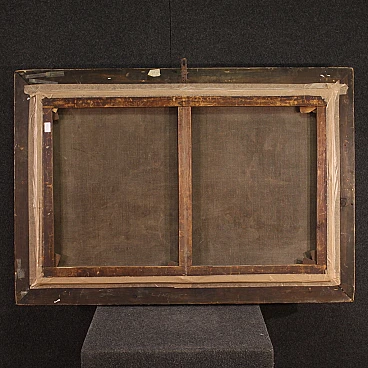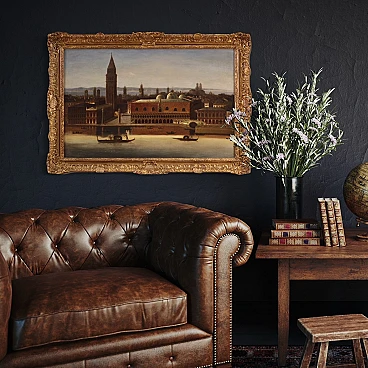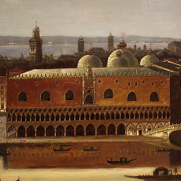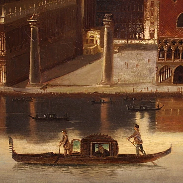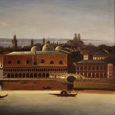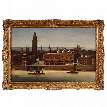 Meravigliosa veduta di Venezia della metà del '700. Opera a olio su tela di grande qualità pittorica, riscontrabile nella resa lenticolare dei minuziosi dettagli del paesaggio. A essere raffigurata è la parte più affascinante e importante della città, infatti ci troviamo sul Canal Grande e vediamo Piazza San Marco in tutto il suo splendore con l'immenso campanile, oltre allo splendido Palazzo Ducale. Eleganti gondole attraversano il Canale in un'atmosfera rarefatta e dal grande fascino. Per ottenere più verità di quanto non possa l'occhio umano, i vedutisti veneziani, Canaletto compreso, utilizzavano la camera ottica. Con un procedimento simile alla camera oscura si facevano passare dei raggi di luce attraverso un forellino all'interno di una scatola. Una volta riflessa su un foglio di carta l'artista ricalcava l'immagine come fosse un disegno, uno schizzo molto dettagliato che sarebbe servito successivamente per realizzare il dipinto vero e proprio. Magnifica cornice non coeva dell'800 in legno scolpito e dorato, di grande decorazione. Opera che ha subito un intervento di restauro con rintelo, sostituzione del telaio e ripresa del colore in alcuni piccoli punti. Nel complesso in ottimo stato conservativo. Misure senza cornice: 66 x 104 cm.