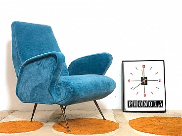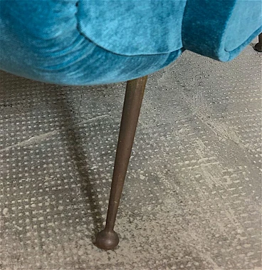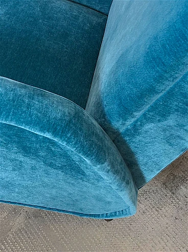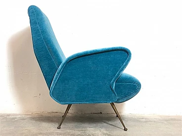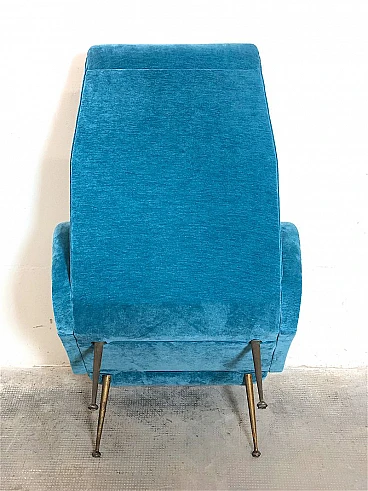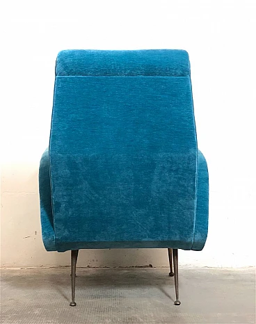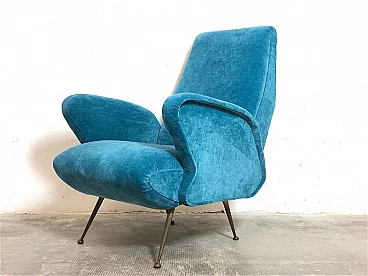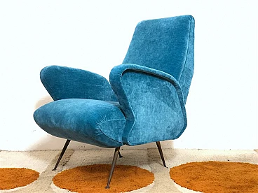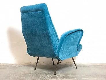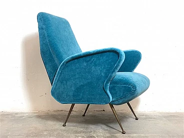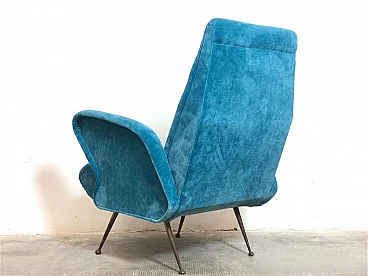 Questa poltrona incarna lo stile e l'eleganza del design italiano dell'epoca. Perfetto esempio di artigianalità e innovazione, la poltrona rappresenta un equilibrio tra forma e funzione, con linee pulite e meticolosa attenzione ai dettagli. Una poltrona caratterizzata da una solida struttura in legno massello, il rivestimento è in velluto melange azzurro. La seduta è ampia e accogliente studiata per offrire il massimo comfort, le imbottiture sia del sedile che dello schienale sono completamente sostituite.