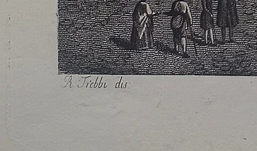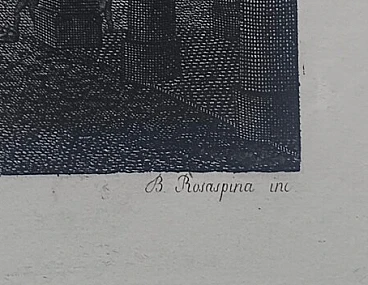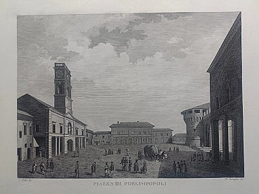 Acquaforte di Bernardino Rosaspina (Venezia 1797 – Bologna 1882) raffigurante la piazza di Forlimpopoli. Bernardino nasce in una celebre famiglia di artisti: incisori erano il padre Giuseppe (Bologna 1765 – 1832) e lo zio Francesco (Montescudo, Rimini 1762 – Bologna 1841), fondatore della cattedra di incisione all’Accademia di Belle Arti di Bologna. Il suo stile è influenzato dalla tradizione scenografico-quadraturista, dal linguaggio di Felice Giani (San Sebastiano Curone 1758 – Roma 1823) e soprattutto dal vedutismo settecentesco. Si specializza nelle incisioni di vedute realizzando due serie: una di 33 tavole dedicata alla Romagna "Vedute di Romagna" (1831-1836) e l'altra alla Toscana "Viaggio storico pittorico ossia guida della Toscana" (1832). In questo foglio, tratto da un disegno di R. Trebbi, come inciso in basso a sinistra, l'artista raffigura con un taglio prospettico la piazza di Forlimpopoli. Diversi personaggi popolano piazza Garibaldi e si muovono tra il Palazzo della Torre a sinistra e la Rocca Albornoziana sul lato opposto. In basso al centro oltre l'immagine inciso il titolo, a destra B. Rosaspina inc. Timbro a secco RB. Impressione eccellente. Ottimo stato di conservazione, eccetto qualche minima abrasione restaurata al verso. Bibliografia: Luigi Servolini, Dizionario Illustrato degli incisori italiani moderni e contemporanei, Milano, Gorlich, pp. 706-707.