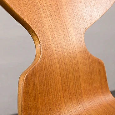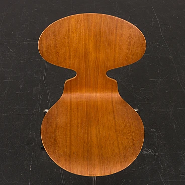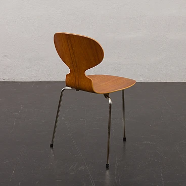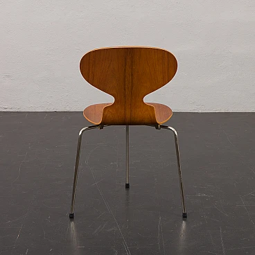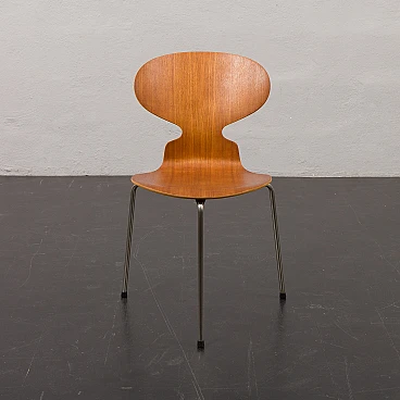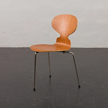 Sedia Ant (mod. 3100) in teak di Arne Jacobsen per Fritz Hansen (Danimarca), primi anni '50. È un pezzo fondamentale nella storia del design del mobile moderno. Concepita inizialmente nel 1952, la sedia Ant fu innovativa per l'epoca, mostrando un'estetica minimalista combinata con tecniche di produzione avanzate. Arne Jacobsen, architetto e designer noto per il suo approccio innovativo, ha creato la sedia Ant con l'intento di raggiungere sia funzionalità che bellezza. La forma particolare della sedia, che ricorda una formica con la testa sollevata, è caratterizzata da un unico pezzo di compensato pressofuso che forma sia il sedile che lo schienale. Questa forma organica offre comfort e sostegno eccezionali, seguendo il principio di Jacobsen di progettare mobili che si adattino alla forma naturale del corpo umano. La caratteristica più rivoluzionaria della sedia Ant risiede nella sua costruzione: Jacobsen ha utilizzato una nuova tecnica di modellatura del compensato, ottenendo una struttura leggera ma robusta. La sedia poggia su una base a tre gambe in tubolare d'acciaio, che ne sottolinea ulteriormente il design minimalista e garantisce stabilità. L'uso di tre gambe, sebbene non convenzionale, è stata una scelta deliberata di Jacobsen per ottenere un profilo elegante e discreto. Versioni successive della sedia furono prodotte con quattro gambe per soddisfare le preferenze di mercato più ampie. Con la sua forma semplice ma elegante, unita alla praticità e all'alta qualità artigianale, la sedia Ant è adatta a diversi ambienti, dalle sale da pranzo moderne agli uffici. Nonostante il passare del tempo, la sedia qui proposta rimane in perfette condizioni originali con solo minimi segni del tempo. L'incisione del produttore sul fondo ne conferma l'autenticità. Le gambe in acciaio sono state pulite e il legno preservato con composti professionali. Altezza seduta: 43 cm.