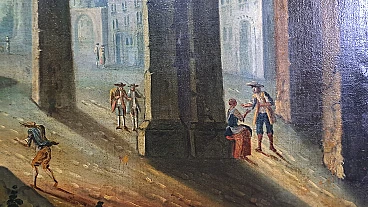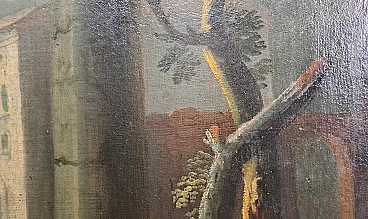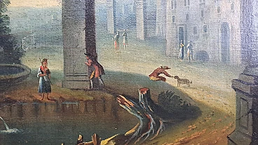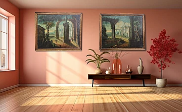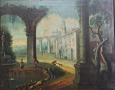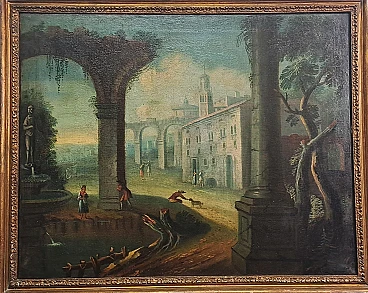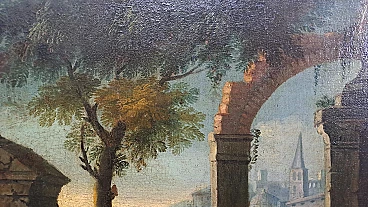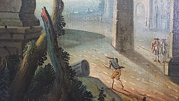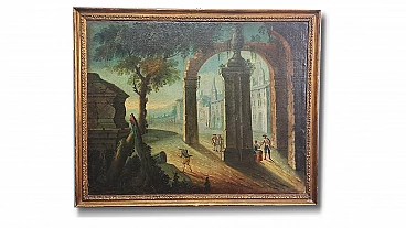 Coppia di dipinti ad olio su tela raffiguranti capricci archiettonici con rovine e figure. Opere di ottima qualità pittorica raffigurano due paesaggi animati da figure popolari all' interno di rovine romane.