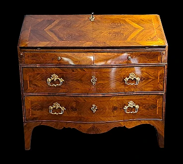 Cassettone a ribalta in legno di noce. Il fronte dalla linea mossa presenta due cassetti grandi in colonna e due più piccoli, al di sotto della calatoia. Lo scarabattolo si compone di diversi cassettini, uno sportellino e vani a giorno. Piedi leggermente mossi nella parte interna si raccordano al grembiale sagomato. Il fronte e la calatoia sono lastronati in legno di noce disposto a lisca di pesce e i profili sono contornati da filetti in bois de rose. Le catene tra i cassetti e le cornici che li riquadrano sono realizzati con legno disposto di testa.