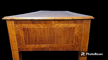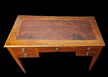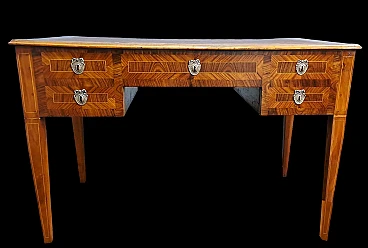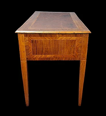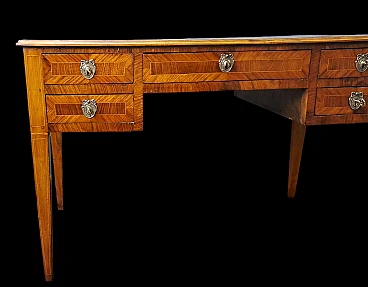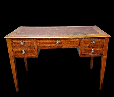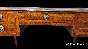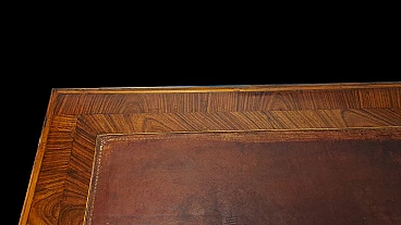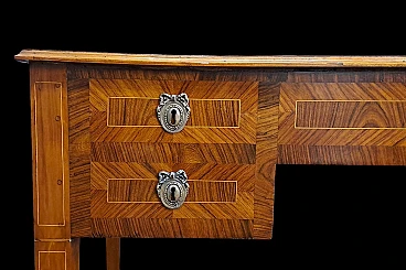Scrivania interamente impiallacciata in legno di palissandro e bois de rose. Il fronte si compone di doppi cassettini posti in colonna lateralmente ed uno più grande al centro. La disposizione della venature delle essenze disposta a lisca di pesce con verso contrapposto genera un piacevole motivo decorativo. Le gambe sono a tronco di piramide rovesciata ed il piano è rivestito in cuoio d' epoca. Il mobile à da centro presentando sul lato opposto a quello dei cassetti la medesima lavorazione del fronte. Bocchette in ottone.