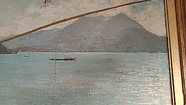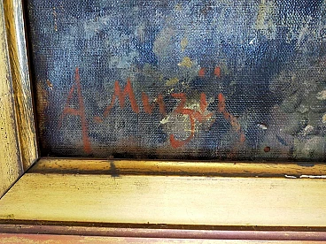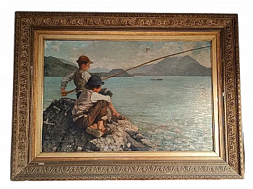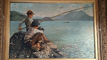 Grande dipinto a olio su tela di Alfonso Muzii (Castellamare 1856 - Pescara 1946) raffigurante una marina con pescatori, seconda metà dell'800. Cornice coeva. Alfonso Muzii trascorre la giovinezza nel paese natale ma quando sceglie di dedicarsi all'arte dovrà abbandonare l'Abruzzo; dapprima all'Accademia di Firenze, sotto la guida di Stefano Ussi, e poi a Napoli alla scuola di Domenico Morelli e Filippo Palizzi. Agli inizi degli anni '80 dell'800, frequenta con una certa assiduità il Convento di Michetti, a Francavilla, dove conosce tutti quegli artisti che ne facevano parte. Francesco Paolo Michetti esercita su di lui una grossa influenza; totalmente rapito dal suo fascino artistico, realizza i suoi primi lavori ispirati alle tele del Maestro. Nel 1883 è presente all'Esposizione di Roma dove presenta alcuni paesaggi e volti sfioriti dei vecchi con le loro mille sottili grinze e asprezze, eseguiti con forza e finezza particolarmente apprezzati dal Michetti. È D'Annunzio a darcene contezza: "[…] notevoli per la loro gentile sobrietà di colore e per non so qual sentimento mite di malinconia […] Rappresentavano colline ricoperte d'ulivi sotto un cielo cosparso di nuvole bianche; strade di campagna solitarie tra due siepi fiorite; campi arati di fresco, tutti umidi per la pioggia recente, lunghi filari di alberetti alti e sottili..." (G. D'Annunzio 1887). Tra il 1882 e il 1884 completa alcune importanti opere: Giovine mendicante, Gessaiuolo di Manoppello, Spaccalegna e Mungià. Nel 1883 e nel 1885 è presente alla Promotrice di Napoli. Nel 1884 espone a Torino le opere Femmine di terra d’Abruzzi e Maschi di razza d'Abruzzi. L'anno seguente prende parte alla Mostra di Berlino e all'Esposizione Nazionale di Anversa con due paesaggi su tela. Nel 1886 invia all'Esposizione di Brera a Milano tre ritratti muliebri eseguiti con mirabile finezza. Dopo aver esposto nel 1887 a Venezia Sulle rive dell'Adriatico intraprende un viaggio che lo porterà a soggiornare per qualche anno; tornato in Europa si stabilirà per qualche tempo a Genova e nella Riviera di ponente, a Milano, sui laghi della Lombardia e quindi a Parigi. Nel 1893, prese parte con Michetti ad una esposizione romana di Belle Arti e poi di nuovo in mostra a Milano nello stesso anno con Studio di paese, In attesa e Tentazione, Bordighera, Olivo a Bordighera. Nel marzo del 1894 partecipa alla Promotrice di Roma. Nel 1897 prende parte nuovamente alla Triennale di Brera a Milano con vari ritratti e paesaggi liguri e lombardi. Nel 1898 è a Torino con Autunno; nel 1901 a Firenze con Studi di testa e Oliveto in Bordighera. Nel 1901 invia a Venezia, alla IV Esposizione Internazionale, un pastello dal titolo Le due sorelline. Dall'inizio del nuovo secolo fino a tutti gli anni '30, si stabilisce ancora in Liguria e poi nel Verbano a Suna. Agli inizi degli anni '40 torna in Abruzzo, si stabilisce a Pescara, abbandona la pittura e chiude le sue tele in una stanza buia. Non vende i suoi quadri nonostante le molte richieste. Nonostante la sua vastissima e apprezzabilissima produzione, la figura di Muzii resta sconosciuta, fu il suo modo d'essere a far sì che la cultura ufficiale lo ignorasse, nonostante non ostentasse particolare distacco da essa, inviò infatti quadri a più di una mostra nazionale e alla IV Internazionale di Venezia. La sua ricerca artistica si inserisce comunque nel più ampio panorama culturale del Verismo di fine '800, del quale Muzii darà una interpretazione estremamente personale, fatta di toni pacati e delicati. Fra i suoi dipinti più importanti ricordiamo ancora Nelle braccia della mamma, Il pretendente e Spiaggia di Liguria.