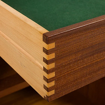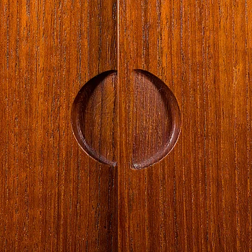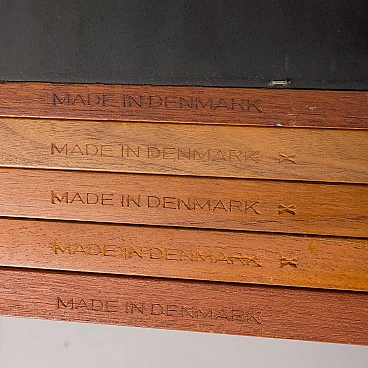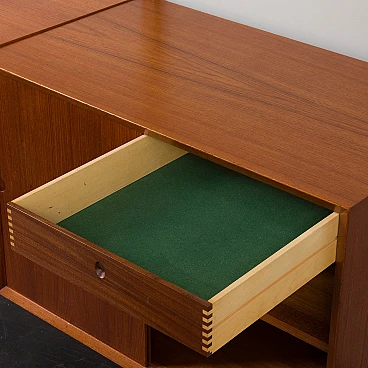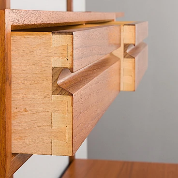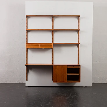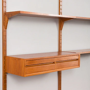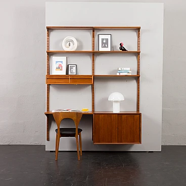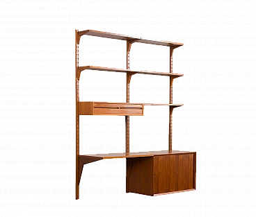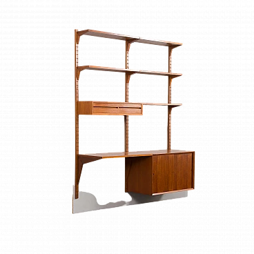 Libreria Royal System in teak di Poul Cadovius per Cado (Danimarca), anni '60. È una composizione a due campate interamente modulare. Un armadietto, cinque ripiani e una piccola consolle forniranno spazio sufficiente per riporre gli oggetti, mentre il compatto scrittoio crea uno spazio per lavorare o studiare a casa. Il mobiletto è dotato di due cassetti interni con tessuto verde e ripiani regolabili. Tre montanti in legno con fori inclinati, una caratteristica delle prime edizioni dei pensili di Cadovius, forniscono un facile sistema di montaggio con varie possibilità di disposizione. Il mobile presenta una falegnameria brillante e mette in mostra le ricche venature del legno di teak. Il profilo del bordo leggermente inclinato rivela la maestria dell'artigianato danese. Cadovius considerava questo sistema uno dei suoi progetti più esclusivi e di successo. È facile da montare a parete, con ogni componente montato sui fori dei tasselli senza alcuna sospensione visibile. Il sistema è interamente modulare e consente di posizionare mobiletti e mensole secondo necessità; la configurazione mostrata è solo un esempio. Le cinque mensole sono larghe 80 cm e profonde 22 cm. Il mobiletto con ante scorrevoli e due cassetti interni e ripiani è alto 51 cm, largo 80 cm e profondo 46 cm; i cassetti sono alti 7 cm. La consolle con due cassetti è alta 15 cm, larga 80 cm e profonda 28 cm. Lo scrittoio è largo 80 cm e profondo 46 cm. I tre montanti sono lunghi 200 cm. La libreria è stata controllata attentamente: tutte le parti si incastrano e i cassetti e gli interni sono puliti e scorrono senza intoppi. L'incisione "Made in Denmark" si conservata sulle mensole. Il mobile è in fantastiche condizioni vintage con lievi segni d'uso. Il legno è stato rivestito con strati aggiuntivi di olio danese.