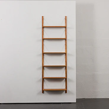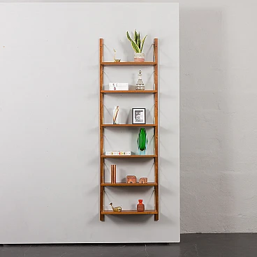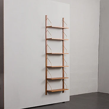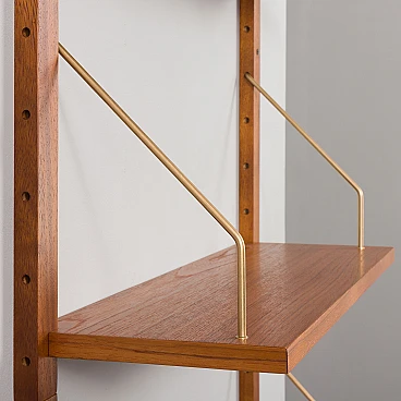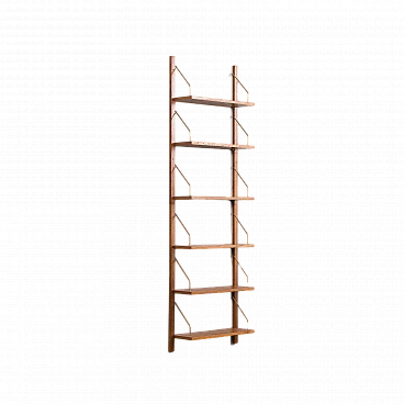 Libreria pensile in teak e ottone nello stile di Poul Cadovius e Preben Sorensen. Questo mobile è stato creato usando elementi vecchi e nuovi, mantenendo lo stile del design degli anni '60. È dotato di un sistema di scaffalature interamente modulare, perfetto per esporre libri e decorazioni. I ripiani possono essere posizionati più in alto o più in basso a seconda delle proprie esigenze. I montanti sono divisi in quattro parti che consentono diverse impostazioni, comprese configurazioni parallele e semiparallele; la configurazione dipende quindi dalle vostre preferenze ed esigenze. Le sei mensole sono larghe 60 cm e profonde 20 cm. I quattro montanti sono lunghi 100 cm ciascuno. Il legno è stato trattato con olio protettivo per esaltarne le venature. Tutti i ripiani hanno una nuova impiallacciatura e sono stati tinti e rifiniti per ottenere un aspetto uniforme. Il pezzo è in condizioni fantastiche e l'effetto finale è incredibile.