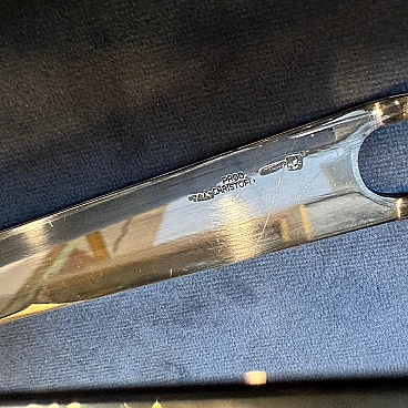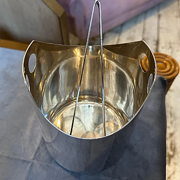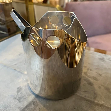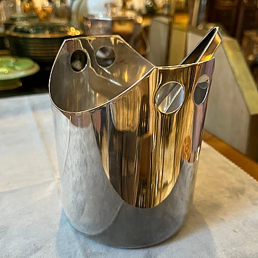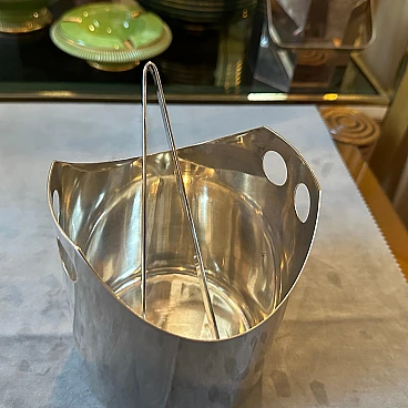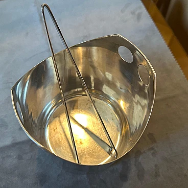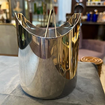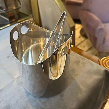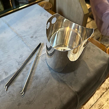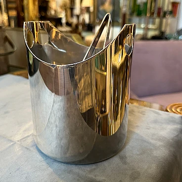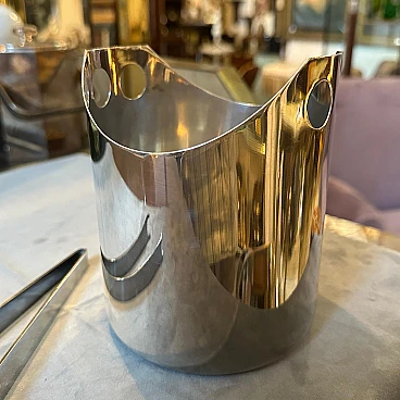 Secchiello per ghiaccio placcato argento di Lino Sabattini con pinza, anni '90. Il secchiello è prodotto da Sabattini Argenteria, la pinza da Christofle. I due pezzi iconici del design sono in perfette condizioni, il secchiello probabilmente non è mai stato usato. Il secchiello e le pinze sono realizzati in metallo di alta qualità, placcato in argento. La placcatura in argento conferisce agli articoli una finitura riflettente e lucente che ne esalta l'aspetto moderno e sofisticato. Conosciuti per la loro meticolosa attenzione ai dettagli e per gli elevati standard di artigianalità, i pezzi di Sabattini sono ben costruiti e garantiscono sia la durata che l'estetica.