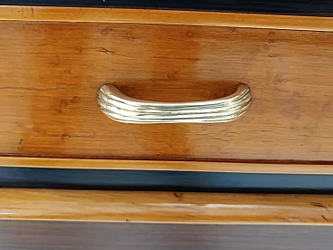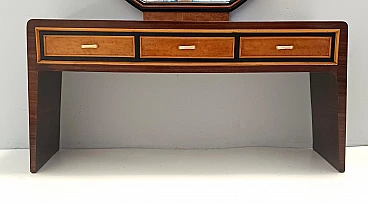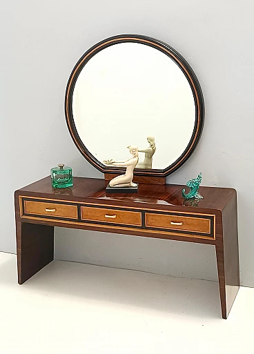 Toeletta/consolle con specchio attribuita a Paolo Buffa, anni '50. Struttura in noce ebanizzato e betulla, maniglie in ottone, vetro molato. È stata restaurata di recente ma è un pezzo d'epoca quindi potrebbe presentare lievi tracce d'uso; nel complesso può essere considerata in ottime condizioni originali. Esistono diversi modelli di questo tipo di toeletta, con due o tre cassetti; un modello simile era all'asta come opera di Paolo Buffa. Con o senza specchio, questa sembra essere la più bella, anche per l'aspetto dello specchio. La consolle è alta 62 cm, larga 133 cm e profonda 41 cm. Lo specchio ha un diametro di 89,5 cm ed è profondo 4,5 cm. Altezza totale: 151 cm.