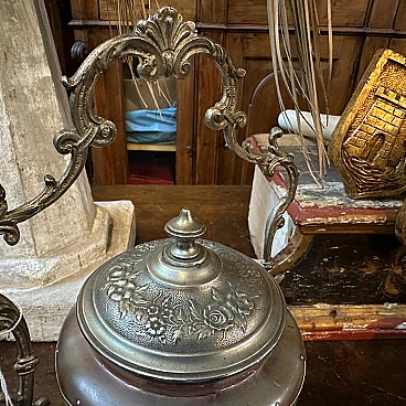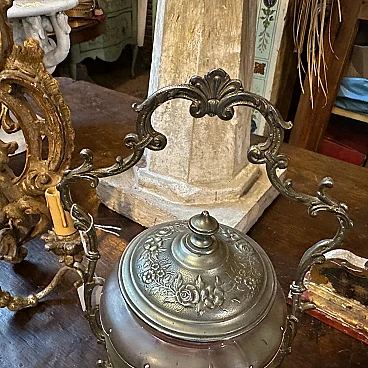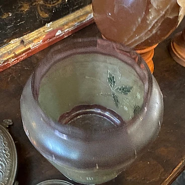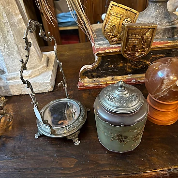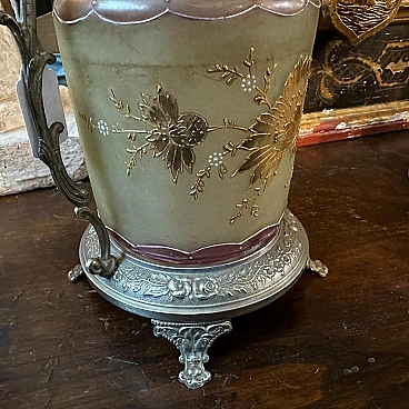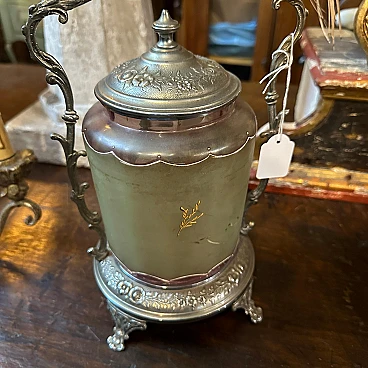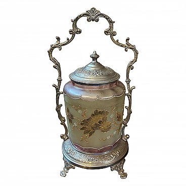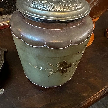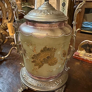 Scatola per biscotti Art Nouveau francese in metallo e vetro, inizio '900. È un esempio lampante dell'eleganza e della maestria tipiche del movimento Art Nouveau. È caratterizzata da una base e da una struttura in metallo argentato con disegni intricati e fluidi ispirati alle forme naturali. La componente in vetro artistico è altrettanto notevole: il vetro è soffiato a mano e presenta dei colori sfumati con un delicato effetto iridescente. Il vetro è arricchito da elaborati motivi floreali che completano la struttura in metallo. Il coperchio ha una maniglia in metallo decorata con elementi scultorei. All'interno, la scatola è abbastanza spaziosa da contenere un assortimento di biscotti o altre piccole prelibatezze, rendendola un pezzo funzionale e decorativo con un design e una lavorazione squisiti.