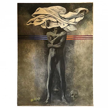 Silvio Benedetto è un pittore e scultore italiano di origine argentina. Nato in una famiglia di artisti di origine italiana, vive e dipinge in Sicilia. Questo enorme olio su tela raffigura un uomo nudo con un lenzuolo bianco che gli nasconde la testa.