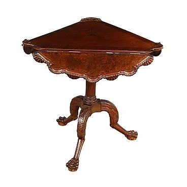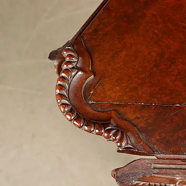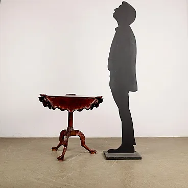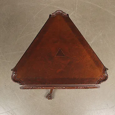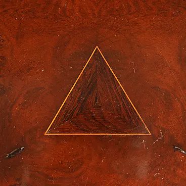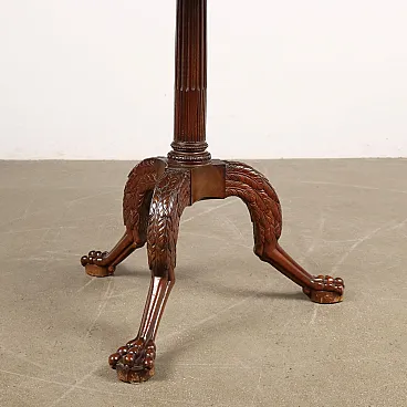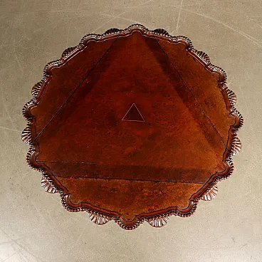 Tavolino da salotto con piano circolare a bandelle in mogano e radica