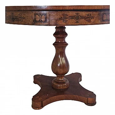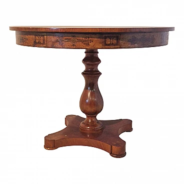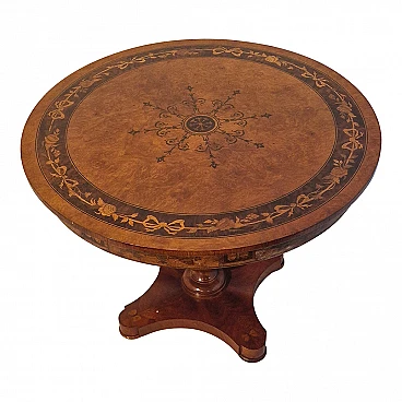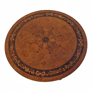 Tavolo tondo intarsiato in noce e radica di noce, anni '40