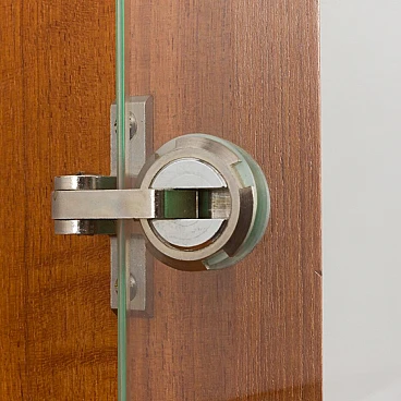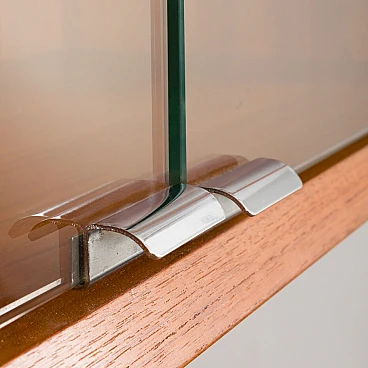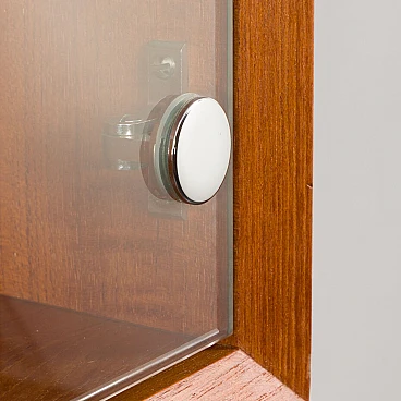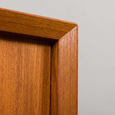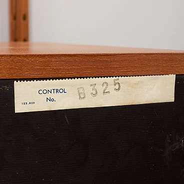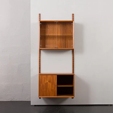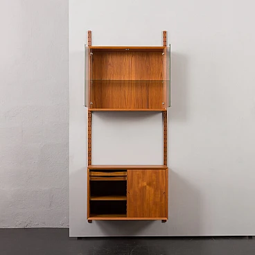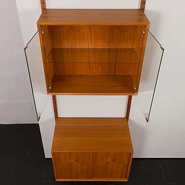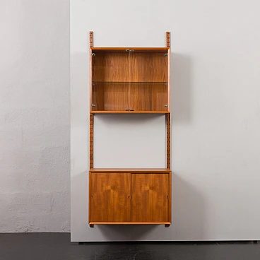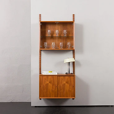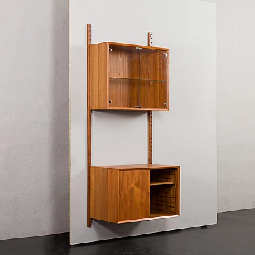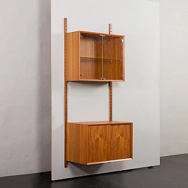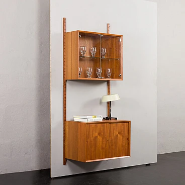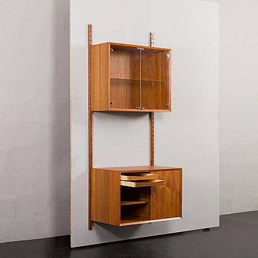 Una funzionale parete attrezzata Royal system in teak di Poul Cadovius degli anni '60 è una composizione a una campata, ideale per un piccolo soggiorno o una camera da letto. Un armadietto e un'ampia vetrina offrono un ampio spazio di archiviazione e permettono di esporre libri o decorazioni. È adatto agli amanti del vinile per esporre grammofoni e dischi in vinile. Due binari in legno con fori inclinati - una firma delle prime edizioni dei pensili Cadovius - forniscono un facile sistema di montaggio con varie possibilità di disposizione. Il set è caratterizzato da una brillante falegnameria e mette in mostra le ricche venature del legno di teak. Il profilo leggermente inclinato dei bordi dei pensili dimostra la maestria dell'artigianato danese. Cadovius considera il sistema Cado uno dei suoi progetti più esclusivi e di successo. Il sistema è facile da montare a parete: ogni componente è montato su fori per tasselli senza alcuna sospensione visibile. Questo mobile a parete vintage è interamente modulare e consente di posizionare i mobili secondo le necessità. La configurazione illustrata è solo un esempio. Il set è composto da: un mobile con ante scorrevoli e due cassetti e ripiani interni; H:52 / L: 80 / P: 46 cm; altezza cassetti: 3 cm; un mobile con ante in vetro H: 65 / L: 80 / P: 30 cm; 2 binari in legno, ciascuno lungo 200 cm.