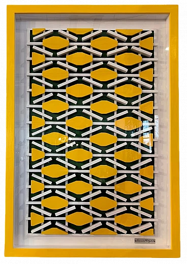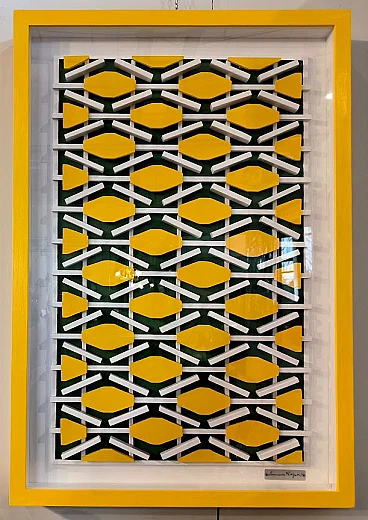 Opera a tecnica mista del 2023 di Domenico Fatigati, maestro del "rigorismo costruttivo" e dell'"astrazione geometrica". Domenico (Mimmo) Fatigati è nato nel 1949 ad Acerra (NA) dove vive e lavora ancora oggi. Domenico Fatigati - Il rigore dello spazio e del colore L’opera di Domenico Fatigati si inserisce nel solco nobile dell’astrazione geometrica, dove la forma è misura, il colore è struttura, e lo spazio si fa progetto. Architetto di formazione e artista per vocazione, Fatigati plasma superfici e volumi con un approccio che coniuga il pensiero razionale con una sensibilità costruttiva fuori dal comune. Le sue opere non sono mai puramente decorative: sono dispositivi visivi che dialogano con l’ambiente, con la luce e con il movimento di chi le osserva. Utilizzando materiali industriali e tecniche derivate dal design, l’artista lavora sul limite sottile tra pittura e scultura, tra il bidimensionale e il tridimensionale. Non realizza opere su tela nel senso tradizionale, ma strutture e composizioni che si avvicinano alla progettualità architettonica, dove ogni elemento è calibrato, ogni linea ha un peso, ogni vuoto ha un senso. Le superfici si articolano in piani e cromie primarie che non solo definiscono la composizione, ma determinano il modo in cui l’opera si rapporta allo spazio circostante. Il suo è un rigorismo costruttivo che non rinuncia all’emozione. Il ritmo, la simmetria, la variazione modulare dei suoi interventi plastici dimostrano una padronanza tecnica che si accompagna a un pensiero estetico maturo e coerente. Fatigati non cerca la sorpresa, ma l’essenza. La sua arte è fatta di silenzi visivi, di pause strutturate, di armonie calibrate. In un’epoca dominata dal rumore dell’eccesso visivo, la sua ricerca si presenta come un invito alla contemplazione e alla misura. In questo senso, le sue opere trovano un dialogo ideale con l’architettura razionalista e il design minimale, senza mai scadere nella fredda ripetizione. Ogni opera è un’unità a sé, ma anche parte di un più vasto ragionamento estetico che attraversa tutto il suo percorso artistico. Fatigati costruisce, compone, riflette. Ogni pezzo è un luogo mentale, una visione in equilibrio tra pensiero e forma.