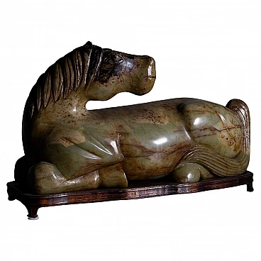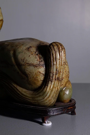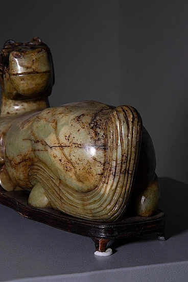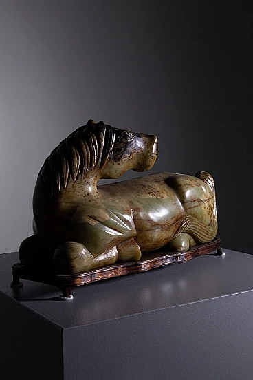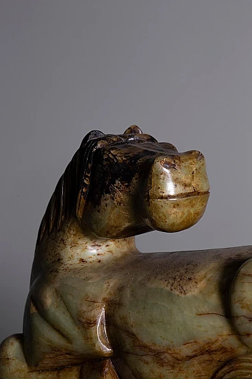 Scopri la tranquilla eleganza di questa statuetta verde di giada, uno splendido pezzo di artigianato che cattura l'essenza e la maestosità della forma equina. Scolpita meticolosamente in squisita giada, questa scultura irradia una serena traslucenza e dettagli precisi che sottolineano il fascino naturale del materiale. La posizione di riposo della statuetta conferisce un effetto calmante, rendendola un'acquisizione ideale per i collezionisti e per coloro che apprezzano l'arredamento raffinato. La scultura è magistralmente modellata per rappresentare le linee fluide e i contorni aggraziati di un cavallo a riposo, con particolare attenzione alle ampie curve della sua criniera e all'equilibrio della sua postura. Le ricche tonalità verdi della giada sono evidenziate dalla marmorizzazione intrinseca della pietra, aggiungendo strati di profondità visiva e rendendo ogni angolo unico accattivante. Questo cavallo di giada è più di un elemento decorativo; è un pezzo d'arte che porta un tocco di tranquillità e raffinatezza a qualsiasi ambiente, sia visualizzato in una casa, in ufficio, o come parte di una collezione distinta. Nonostante le sue dimensioni compatte, la statuetta comanda la presenza, migliorando senza sforzo qualsiasi schema di arredamento. Mentre mostra lievi segni di usura che affermano la sua età e autenticità, questi elementi solo aumentare il suo fascino d'epoca e fascino storico, che lo rende un antipasto di conversazione e un cimelio amato.
