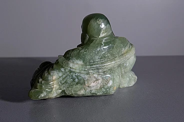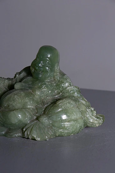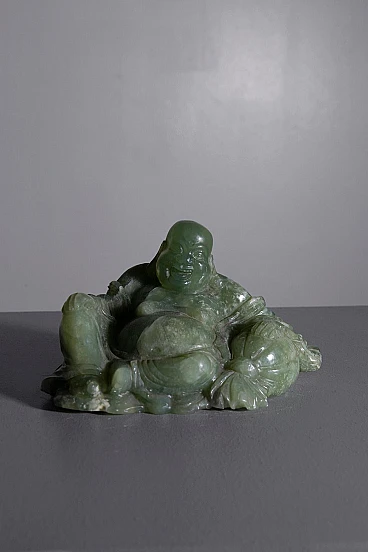 Scultura cinese in giada verde raffigurante Buddha, metà '900. Scolpita nella giada più pregiata, questa statua cattura l'essenza della tranquillità e dell'armonia con il suo ricco colore verde e la maestria artigianale. L'espressione gioiosa e la postura rilassata del Buddha attirano immediatamente lo spettatore, offrendo un senso di pace e appagamento. Realizzato con meticolosa attenzione ai dettagli, i contorni morbidi e i dettagli raffinati di questo Buddha di giada evidenziano l'abilità dell'artigiano. Dalle eleganti pieghe delle vesti alla resa precisa dei lineamenti sereni del viso del Buddha, ogni aspetto di questa statua mostra la profondità della maestria artistica coinvolta. Questa statua non serve solo come splendido pezzo decorativo, ma ha anche un profondo significato simbolico. Rappresenta la saggezza, la chiarezza mentale e la purezza emotiva, rendendolo un potente emblema in varie tradizioni culturali. Posizionare questo Buddha nel tuo spazio non solo migliora il fascino estetico ma invita anche una presenza spirituale e calmante nell'ambiente.