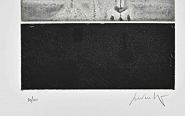 Composizione è un'originale acquaforte in bianco e nero su carta, realizzata dall'artista italiano Cesare Peverelli (Milano, 1922 - Parigi, 2000) e stampata nel 1973 da La Nuova Foglio, casa editrice di Macerata, come riporta il timbro a secco sull'opera angolo in basso a destra.Firmato a mano e numerato a matita e in numeri arabi sul margine inferiore. Da un'edizione di 100 stampe. Si tratta di una composizione istintiva che mostra una linea molto rapida e ricorda il concetto surrealista di scrittura automatica. Un'opera d'arte contemporanea, in ottime condizioni, perfetta per l'arredamento della vostra casa, potrebbe adattarsi a qualsiasi stile di arredamento!