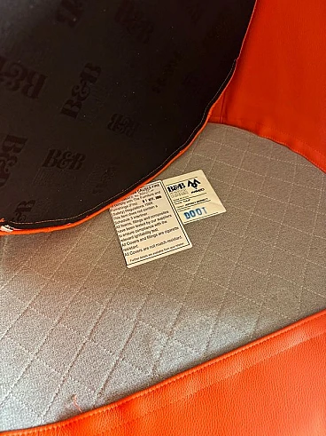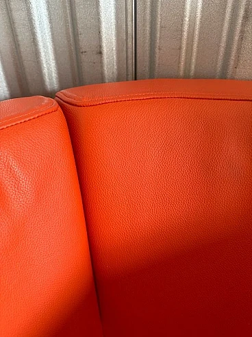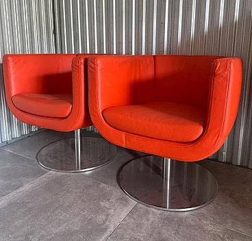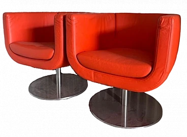 Coppia di poltrone girevoli Tulip in pelle martellata rosso-arancione di Jeffrey Bernett per B&B Italia. Il modello fu presentato la prima volta al Salone del Mobile di Milano nel 2008. Base tonda d'appoggio in alluminio spazzolato lucido. Struttura in tubolare d'acciaio, imbottitura del telaio interno in BAYFIT® della BAYER®, schiuma poliuretanica flessibile, con rivestimento in fibra di poliestere. L'imbottitura del cuscino del sedile è in poliuretano a densità differenziata con rivestimento in fibra di poliestere. Condizioni eccellenti con leggerissimi segni dovuti a presentazioni per corner espositivi fieristici. Altezza della seduta: 44 cm.