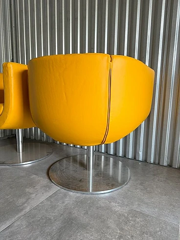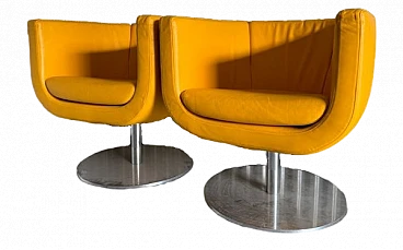 Coppia di poltrone girevoli Tulip di Jeffrey Bernett per B&B Italia. Il modello fu presentato la prima volta al Salone del Mobile di Milano nel 2008. La base tonda d'appoggio è in alluminio spazzolato lucido. Rivestimento in pelle martellata gialla. Telaio strutturale in tubolare d'acciaio mentre l'imbottitura del telaio interno è in BAYFIT® della BAYER®, schiuma poliuretanica flessibile, con rivestimento in fibra di poliestere. L'imbottitura del cuscino del sedile è in poliuretano a densità differenziata con rivestimento in fibra di poliestere. Le poltrone sono in condizioni eccellenti con leggerissimi segni dovuti a presentazioni per corner espositivi fieristici. Altezza della seduta: 44 cm.