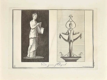 Scena di epoca romana antica della serie "Antichità di Ercolano", è un'originale acquaforte su carta realizzata da Francesco Cepparoli nel XVIII secolo. Firmato sulla targa. Buone condizioni con qualche piegatura. L'acquaforte appartiene alla suite di stampe “Antichità di Ercolano Esposte” (titolo originale: “Le Antichità di Ercolano Esposte”), un volume in otto volumi di incisioni dei reperti provenienti dallo scavo degli scavi di Ercolano nel Regno di Napoli ( ora Campania, Italia). Fu pubblicato tra il 1757 e il 1792 dalla Regia Stamperia e le copie furono consegnate a destinatari selezionati in tutta Europa. Nonostante il titolo, le Antichità di Ercolano riportano oggetti provenienti da tutti gli scavi intrapresi dai Borboni nel Golfo di Napoli. Questi includono Pompei, Stabia e due siti di Ercolano: Resina e Portici. Il re Carlo di Borbone nominò quindici studiosi creando una nuova “Accademia Ercolanese” per studiare i reperti e pubblicare i risultati degli scavi archeologici dei siti. Le incisioni sono di alta qualità e il testo di accompagnamento mostra un'ampia borsa di studio. Furono realizzati da 25 artisti di spicco coinvolti dal Re nella preparazione di disegni e incisioni sui reperti, tra i quali possiamo trovare Giovanni Elia Morghen, Carlo Nolli, Luigi Vanvitelli e Giovanni Battista Casanova. Il libro “Antichità” è stato pensato più per stupire i lettori con la qualità degli oggetti della collezione del Re di Napoli che da destinare alla ricerca, seguendo ed incrementando l'interesse della società del Settecento per la cultura classica e l'Arte in particolare. Attraverso l'esaltazione del concetto classico di proporzioni e armonia , il libro fu di ispirazione al movimento neoclassico in Europa, dando ad artisti e decoratori l'accesso a un vasto negozio di motivi ellenistici. Rif.: National Gallery (Washington), Mark J. Millard Architectural, IV (2000), n. 1; L. Garcia y Garcia, Nova bibliotheca pompeiana (2 v., 1998); Royal Institute of British Architects, British Architectural Library ... Primi libri stampati, 1 (1994), n. 112. U. Pannuti, 'Incisori e disegnatori della Stamperia Reale di Napoli nel secolo XVIII: la pubblicazione delle Antichità di Ercolano', in Xenia antiqua, 9 (2000), p. 151-178; V. Trombetta, 'L'edizione de Le Antichità di Ercolano esposte' in Rendiconti dell'Accademia di Archeologia, lettere e belle arti di Napoli, 59 (1984), p.151-172.