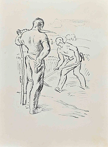Farmers è una litografia originale su carta color avorio realizzata da Wilhelm Gimmi nel 1955 ca. Ottime condizioni. Non firmato, come emesso. L'opera d'arte è creata in uno stile realistico attraverso tratti abili e rapidi, trasmettendo l'emozione della scena in modo delicato, chiaroscuro e tratteggio sono perfettamente applicati. Wilhelm Gimmi (1886-1965) è nato a Zurigo. Nel 1906 si diploma alla Scuola Normale di Küssnacht, poi si iscrive alla Kunstgewerbeschule di Zurigo per insegnare disegno. Studiò all'Académie Julian di Parigi dal 1908 al 1910, poi si unì a Jean Arp, Walter Helbig e Oscar Lüthy nel movimento Modern Bund, fondato da Weggis nel 1911. Residente a Parigi dal 1911 al 1940, fu membro del Salon d"Autunno dal 1920.