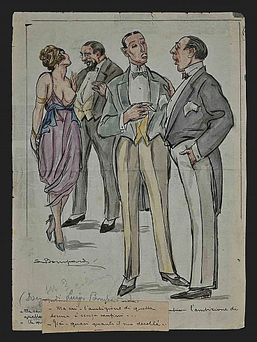 Elite Discourse è un disegno originale ad acquerello e inchiostro su carta color avorio, realizzato negli anni '20 da Luigi Bompard (1879-1953). Firmato a mano a penna sul margine inferiore. In buone condizioni, tranne qualche piccolo taglio sui margini e pieghevole.L'opera d'arte è raffigurata attraverso tratti morbidi con colori armoniosi e delicati attraverso tratti abili e in una composizione ben equilibrata. Le figure sono create con maestria nella scena.