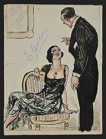 La seduttrice è un disegno originale ad acquerello e inchiostro su carta color avorio, realizzato negli anni '20 da Luigi Bompard (1879-1953). Firmato a mano a penna sul margine inferiore. In buone condizioni, tranne qualche foxing. L'opera è raffigurato attraverso tratti morbidi con colori armoniosi e delicati attraverso tratti abili e in una composizione ben equilibrata. Le figure sono create con maestria nella scena.