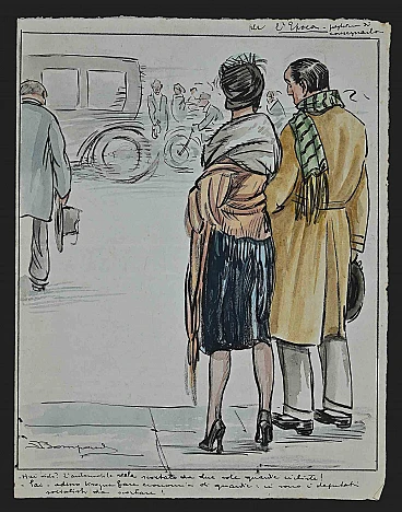 La Strada è un disegno originale ad acquerello e inchiostro su carta color avorio, realizzato negli anni '20 da Luigi Bompard (1879-1953). Firmato a mano a penna sul margine inferiore. In buone condizioni, tranne qualche piega. L'opera è raffigurato attraverso tratti morbidi con colori armoniosi e delicati attraverso tratti abili e in una composizione ben equilibrata. Le figure sono create con maestria nella scena.