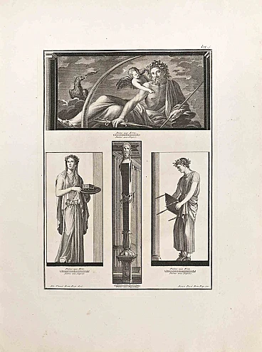 Affreschi romani antichi di Ercolano della serie "Antichità di Ercolano", è un'acquaforte su carta realizzata da Nicola Vanni nel XVIII secolo. Firmato sulla targa. Buone condizioni. L'acquaforte appartiene alla suite di stampe “Antichità di Ercolano Esposte” (titolo originale: “Le Antichità di Ercolano Esposte”), un volume in otto volumi di incisioni dei reperti provenienti dallo scavo degli scavi di Ercolano nel Regno di Napoli ( ora Campania, Italia). Fu pubblicato tra il 1757 e il 1792 dalla Regia Stamperia e le copie furono consegnate a destinatari selezionati in tutta Europa. Nonostante il titolo, le Antichità di Ercolano riportano oggetti provenienti da tutti gli scavi intrapresi dai Borboni nel Golfo di Napoli. Questi includono Pompei, Stabia e due siti di Ercolano: Resina e Portici. Il re Carlo di Borbone nominò quindici studiosi creando una nuova “Accademia Ercolanese” per studiare i reperti e pubblicare i risultati degli scavi archeologici dei siti. Le incisioni sono di alta qualità e il testo di accompagnamento mostra un'ampia borsa di studio. Furono realizzati da 25 artisti di spicco coinvolti dal Re nella preparazione di disegni e incisioni sui reperti, tra i quali possiamo trovare Giovanni Elia Morghen, Carlo Nolli, Luigi Vanvitelli e Giovanni Battista Casanova. Il libro “Antichità” è stato pensato più per stupire i lettori con la qualità degli oggetti della collezione del Re di Napoli che da destinare alla ricerca, seguendo ed incrementando l'interesse della società del Settecento per la cultura classica e l'Arte in particolare. Attraverso l'esaltazione del concetto classico di proporzioni e armonia , il libro fu di ispirazione al movimento neoclassico in Europa, dando ad artisti e decoratori l'accesso a un vasto negozio di motivi ellenistici. Rif.: National Gallery (Washington), Mark J. Millard Architectural, IV (2000), n. 1; L. Garcia y Garcia, Nova bibliotheca pompeiana (2 v., 1998); Royal Institute of British Architects, British Architectural Library ... Primi libri stampati, 1 (1994), n. 112. U. Pannuti, 'Incisori e disegnatori della Stamperia Reale di Napoli nel secolo XVIII: la pubblicazione delle Antichità di Ercolano', in Xenia antiqua, 9 (2000), p. 151-178; V. Trombetta, 'L'edizione de Le Antichità di Ercolano esposte' in Rendiconti dell'Accademia di Archeologia, lettere e belle arti di Napoli, 59 (1984), p.151-172.