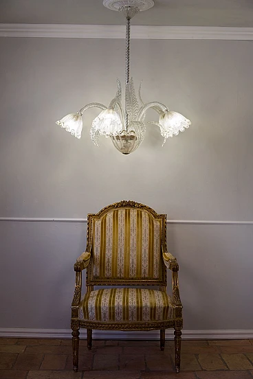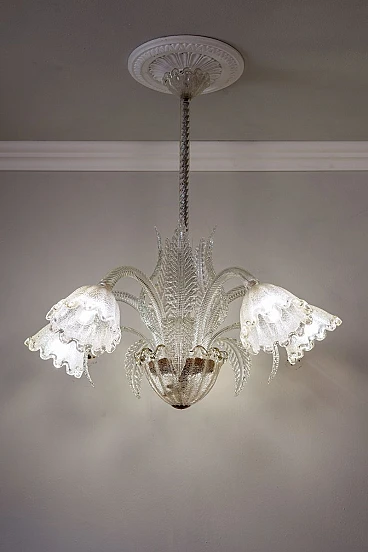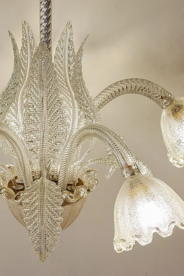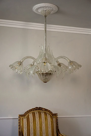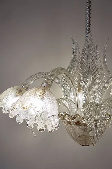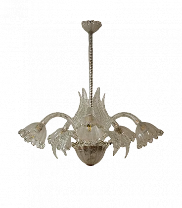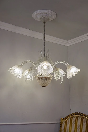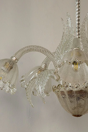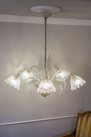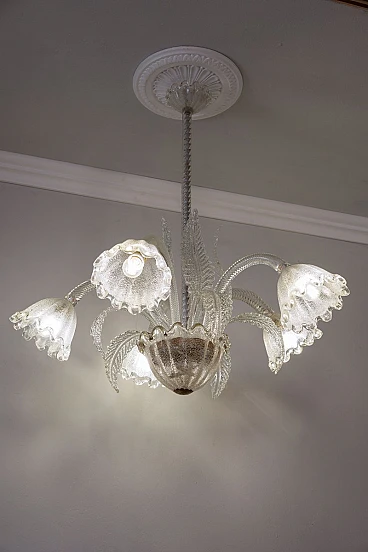 Lampadario a cinque luci in vetro di Murano di Ercole Barovier per Barovier & Toso, anni '30. Le coppe di questo elegante lampadario presentano una raffinata lavorazione in vetro graniglia, un processo che conferisce al vetro una texture unica e preziosa. La lavorazione del vetro graniglia prevede l'applicazione di piccoli frammenti di vetro su una superficie ancora calda, che vengono poi fusi insieme per creare un effetto brillante e ricco di sfumature. Cablato con nuovo impianto elettrico compatibile con quelli europei e statunitensi.