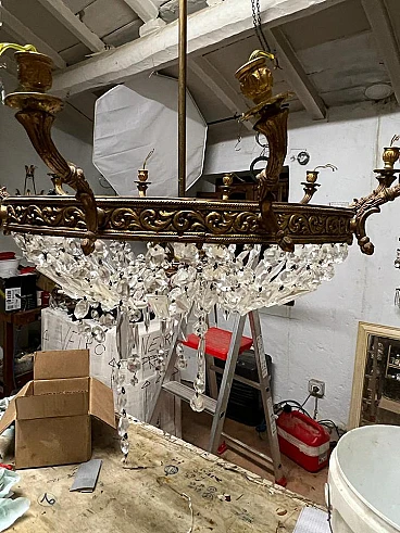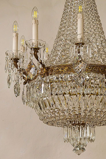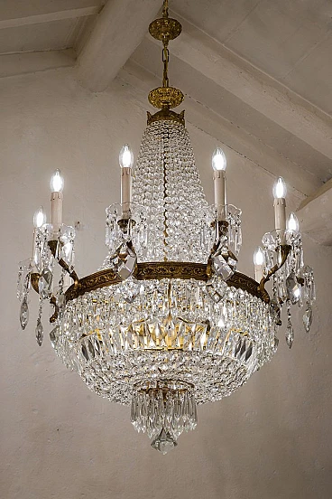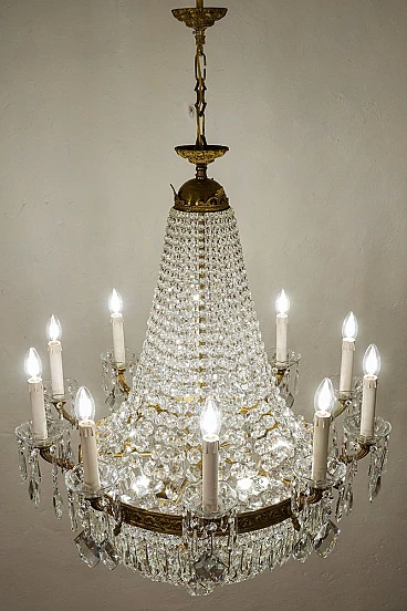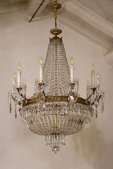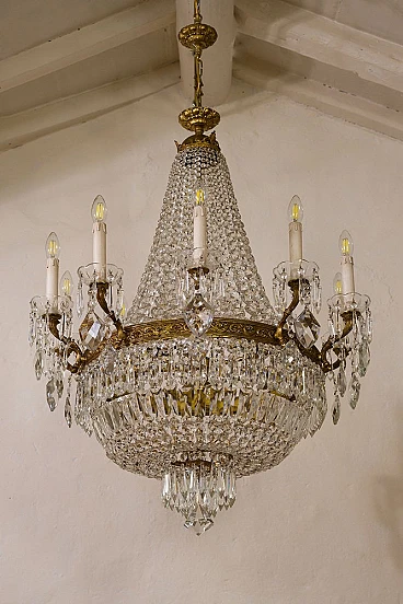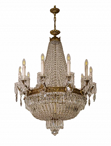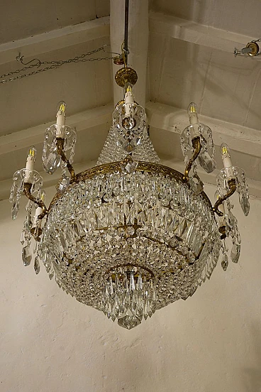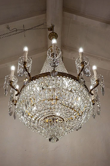 Lampadario a mongolfiera stile Impero in ottone e cristallo, anni '40. Realizzato con una robusta struttura in ottone cesellato, ricoperto da file di ottagoni che scendono dalla corona superiore per raccordarsi in quella inferiore donandogli la forma della mongolfiera. Ad arricchire ulteriormente questo bellissimo lampadario, una moltitudine di prismi pendenti nella fascia centrale, nei piattini e nella fascia bassa del lampadario, oltre alle grandi gocce di cristallo pendenti a forma di scudo che scendono dai bracci. È stato realizzato in Italia a metà del '900 ed è stato completamente restaurato: è stato smontato ogni singolo pezzo di ottone, l'ossido è stato rimosso e tutti i cristalli sono stati puliti e successivamente ricuciti. Impianto elettrico nuovo.