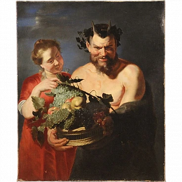 Quadro fiammingo della seconda metà del '600. Opera a olio su tela raffigurante soggetto mitologico dal grande fascino: un Fauno con cesto di frutta e una baccante. Dipinto attribuibile a un seguace di Peter Paul Rubens in quanto copia di altissima qualità di un originale esposto oggi ad Anversa. Da notare la pregevole fattura della cesta di frutta, una strepitosa natura morta ricca di minuziosi dettagli naturalistici. Splendido il fauno che guarda verso di noi rompendo così la quarta parete. Accanto a lui una fanciulla o baccante si avvicina maliziosa. Quadro di notevole qualità pittorica, da notare in particolare l'uso magistrale della tecnica del chiaroscuro per creare plasticità, volume e profondità. Opera che ha subito un intervento di restauro con rintelo, sostituzione del telaio e ripresa del colore in alcuni piccoli punti. Nel complesso in ottimo stato conservativo.