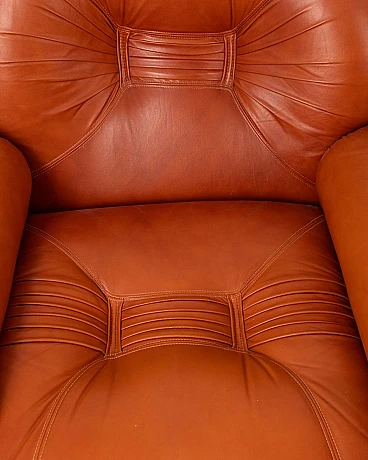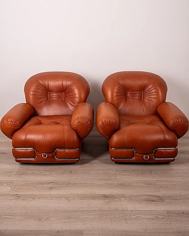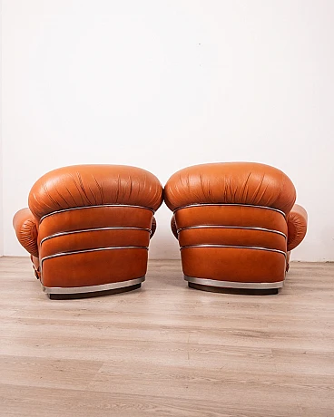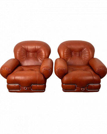 Coppia di Poltrone in pelle marrone, acciaio e legno, anni '70