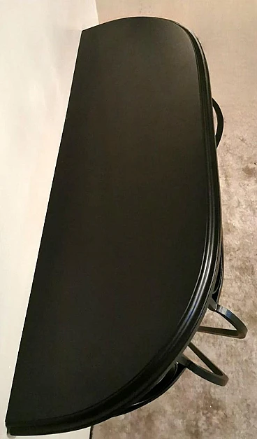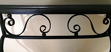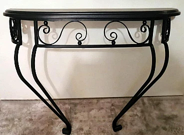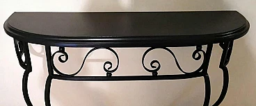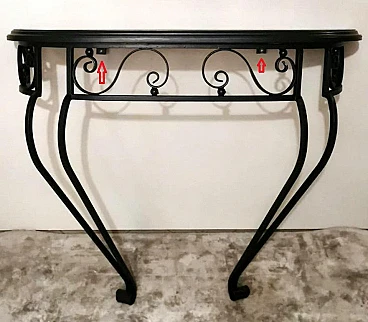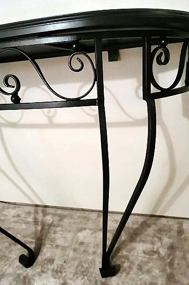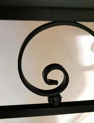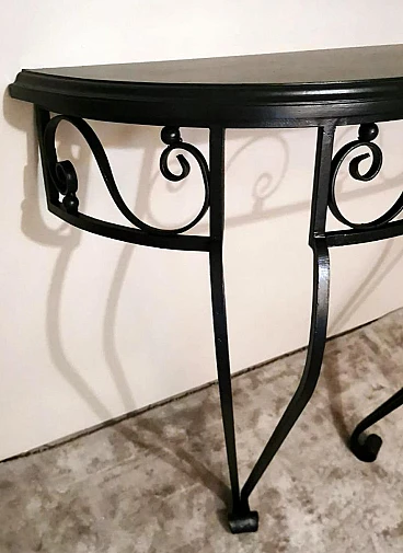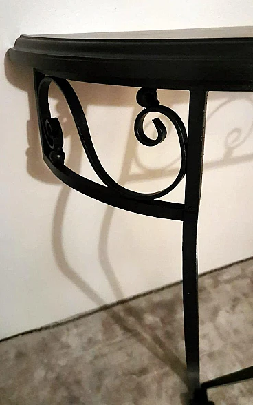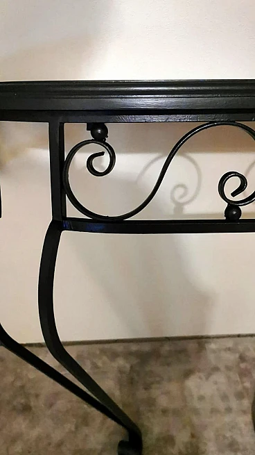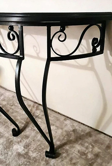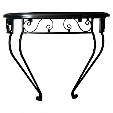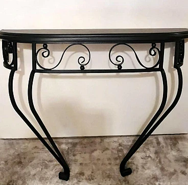 Ti consigliamo di leggere l'intera descrizione, in quanto fornisce informazioni tecniche e storiche dettagliate per garantire l'autenticità dei nostri oggetti. Questa elegante e raffinata consolle da parete in ferro battuto italiano presenta un eccezionale design curvilineo e sottile, esteticamente e simmetricamente perfetto. Il piano superiore è realizzato in legno di alta qualità verniciato di nero, con pochi elementi decorativi semplici e distribuiti in modo razionale. Questo modello ha la comoda caratteristica di essere fissato alla parete per mezzo di due piccole piastre forate saldate al bordo posteriore della consolle (vedi foto), garantendo al mobile una solidità e una stabilità permanenti. La consolle è stata creata tra il 1930 e il 1935 in un'officina di lavorazione del ferro nel quartiere Santo Spirito di Firenze, in Toscana, Italia. Fin dall'antichità, questa parte della città è stata il centro pulsante dell'artigianato fiorentino. Firenze ha una lunga storia di lavorazione dei metalli, che risale al Rinascimento, quando era un importante centro per la produzione di ferro battuto. Gli artigiani fiorentini erano rinomati per gli intricati disegni e per i lavori in ferro di alta qualità, spesso utilizzati per mobili, cancelli ed elementi architettonici. Le consolle in ferro battuto italiane hanno una ricca storia e sono ammirate per la loro maestria, eleganza e durata. L'evoluzione di questi pezzi riflette le tendenze più ampie dell'arte, dell'architettura e dell'interior design in Italia, in particolare in Toscana. L'uso del ferro battuto risale all'antichità, ma durante il tardo Medioevo i fabbri italiani iniziarono a perfezionare le loro abilità, creando manufatti funzionali e decorativi, compresi i mobili. Il Rinascimento (XIV-XVII secolo) fu un periodo importante per l'arte e l'artigianato in Italia. I ricchi mecenati, ispirati dall'antichità classica, commissionavano intricati lavori in ferro battuto per le loro case ed edifici pubblici. La Toscana durante il Rinascimento era il centro mondiale dell'arte, della cultura, della scienza e dell'artigianato. Durante il periodo barocco (XVII-XVIII secolo), le consolle in ferro battuto divennero più stravaganti, caratterizzate da disegni audaci e drammatici con pesanti ornamenti. Il Neoclassicismo (fine 18°-inizio 19° secolo) portò un ritorno alla semplicità e all'ispirazione classica; i mobili in ferro battuto avevano elementi decorativi ispirati all'antica Grecia e a Roma. Tra il XIX e l'inizio del XX secolo, la lavorazione del ferro ha visto un mix di stili, tra cui il revival di periodi precedenti e l'introduzione di nuove tendenze come l'Art Nouveau, con linee organiche e fluide e motivi ispirati alla natura. Nel XX secolo, le consolle in ferro battuto hanno continuato a evolversi, fondendo l'artigianato tradizionale con i principi del design moderno. Gli stili moderni di metà secolo (1920-1950) privilegiavano un design più minimalista, con linee semplici e pulite e forme funzionali. I mobili in ferro battuto possono incorporare vetro e legno. Le consolle in ferro battuto italiane erano tradizionalmente realizzate da abili fabbri con tecniche tramandate da generazioni. Questo comportava il riscaldamento del ferro nelle fucine e la sua modellazione con un martello e un'incudine. Le consolle italiane in ferro battuto sono spesso considerate opere d'arte funzionali, che servono a scopi pratici e fungono da punti focali in una stanza. Questo particolare tipo di tavolo è versatile e si adatta a diversi ambienti, dal classico al contemporaneo. Le consolle antiche in ferro battuto sono molto ricercate dai collezionisti e dai designer d'interni per il loro significato storico e per l'alta artigianalità. In sintesi, le consolle in ferro battuto italiane incarnano una ricca tradizione di artigianato e design. La loro evoluzione riflette i cambiamenti nelle tendenze artistiche e i progressi tecnologici, mantenendo il loro status di pezzi pregiati in interni sia storici che moderni. La console è stata restaurata ed è in condizioni eccellenti. Larghezza 108 cm, profondità 37 cm, altezza 93 cm. Per tutte le nostre spedizioni utilizziamo materiali di imballaggio speciali (casse di legno su misura, polistirolo, etc.) per garantire la massima protezione e sicurezza degli oggetti.