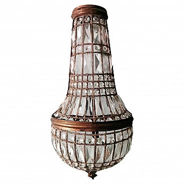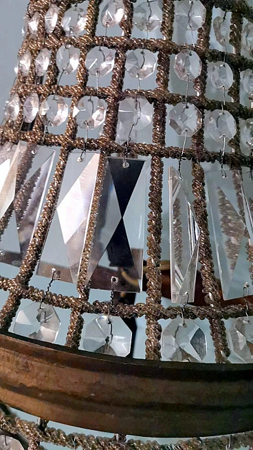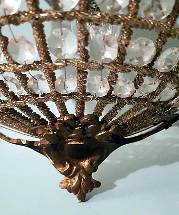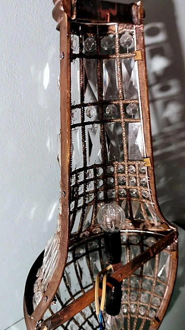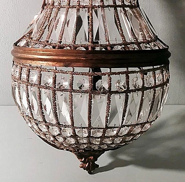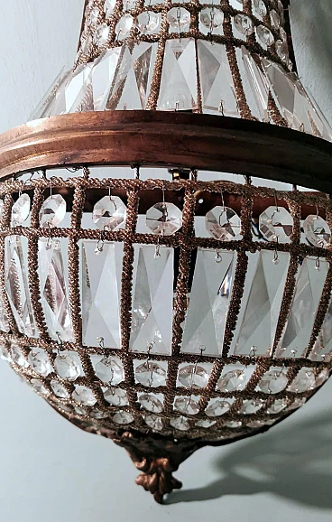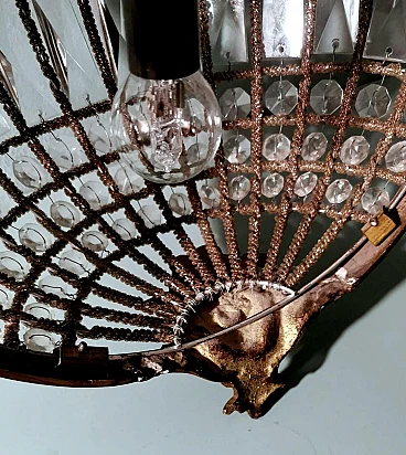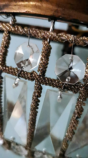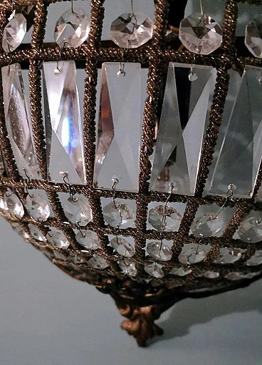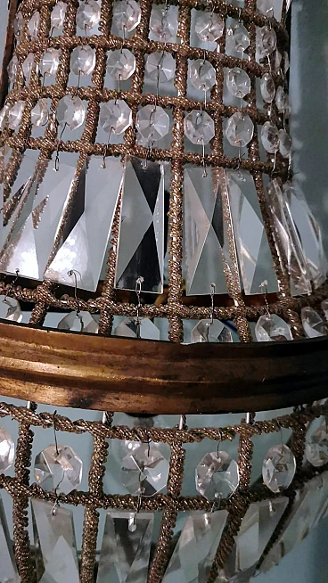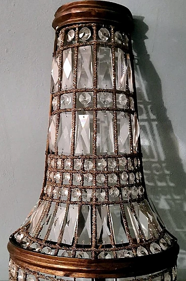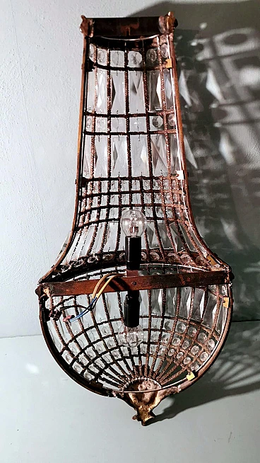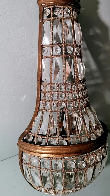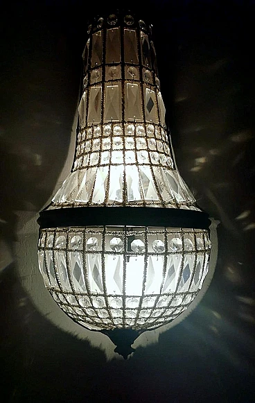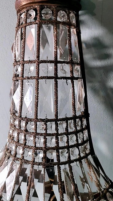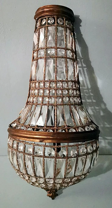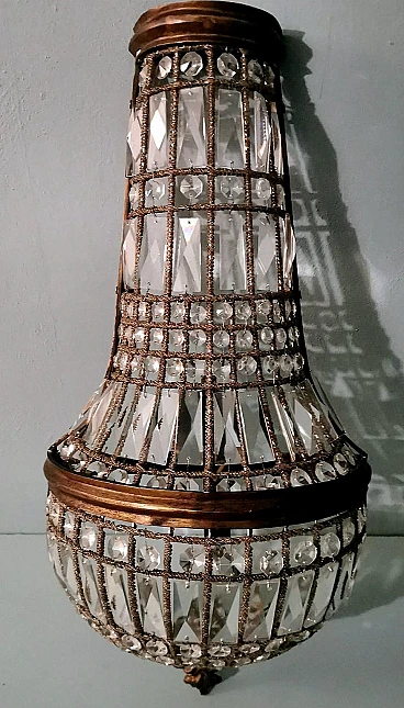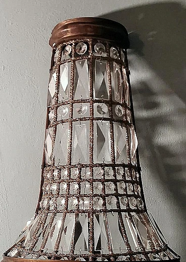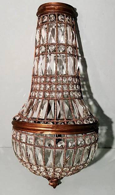 Ti consigliamo gentilmente di leggere l'intera descrizione, poiché il nostro obiettivo è quello di fornirti informazioni tecniche e storiche dettagliate per garantire l'autenticità dei nostri oggetti. Questa elegante e raffinata applique francese presenta la classica forma a mezza sfera tipica del ricco e affascinante stile Luigi XVI. Cristalli tagliati e molati di varie forme sono uniti manualmente da sottili fili di ferro, abilmente distribuiti e appesi a una struttura in ottone bronzato che ricorda un cesto (da qui il nome francese sac-à-perle). L'intera struttura è ricoperta da fili composti da minuscole perline che conferiscono all'applique un aspetto luminoso anche quando è spenta. Il semicerchio centrale è fissato sul retro da una barra con due portalampada, uno rivolto verso l'alto e l'altro verso il basso, per garantire una distribuzione uniforme della luce. Quando l'applique è accesa, i cristalli molati rifrangono la luce in infinite sfaccettature, creando incantevoli riflessi che ne esaltano l'effetto decorativo. Questa applique è stata realizzata a mano tra il 1980 e il 1983 da una piccola azienda alla periferia di Parigi, dando vita a un prodotto unico, prezioso ed elegante. Lo stile è un classico Luigi XVI francese, opulento e raffinato; l'estetica generale è lussuosa, regale e simmetrica, e riflette l'influenza neoclassica dell'epoca Luigi XVI. La comprensione del contesto storico del periodo Luigi XVI e dell'Impero può approfondire l'apprezzamento di questo oggetto. Il design trae ispirazione dall'antichità classica, enfatizzando la simmetria, l'ordine e la grandezza. La sua estrema classicità e le sue linee romantiche lo rendono versatile e facilmente collocabile in qualsiasi ambiente. L'applique è in buone condizioni. Misura 33 cm di larghezza, 18 cm di profondità e 73 cm di altezza. Per tutte le nostre spedizioni utilizziamo materiali di imballaggio speciali (casse di legno, polistirolo, etc.) per garantire la massima protezione e sicurezza degli oggetti.